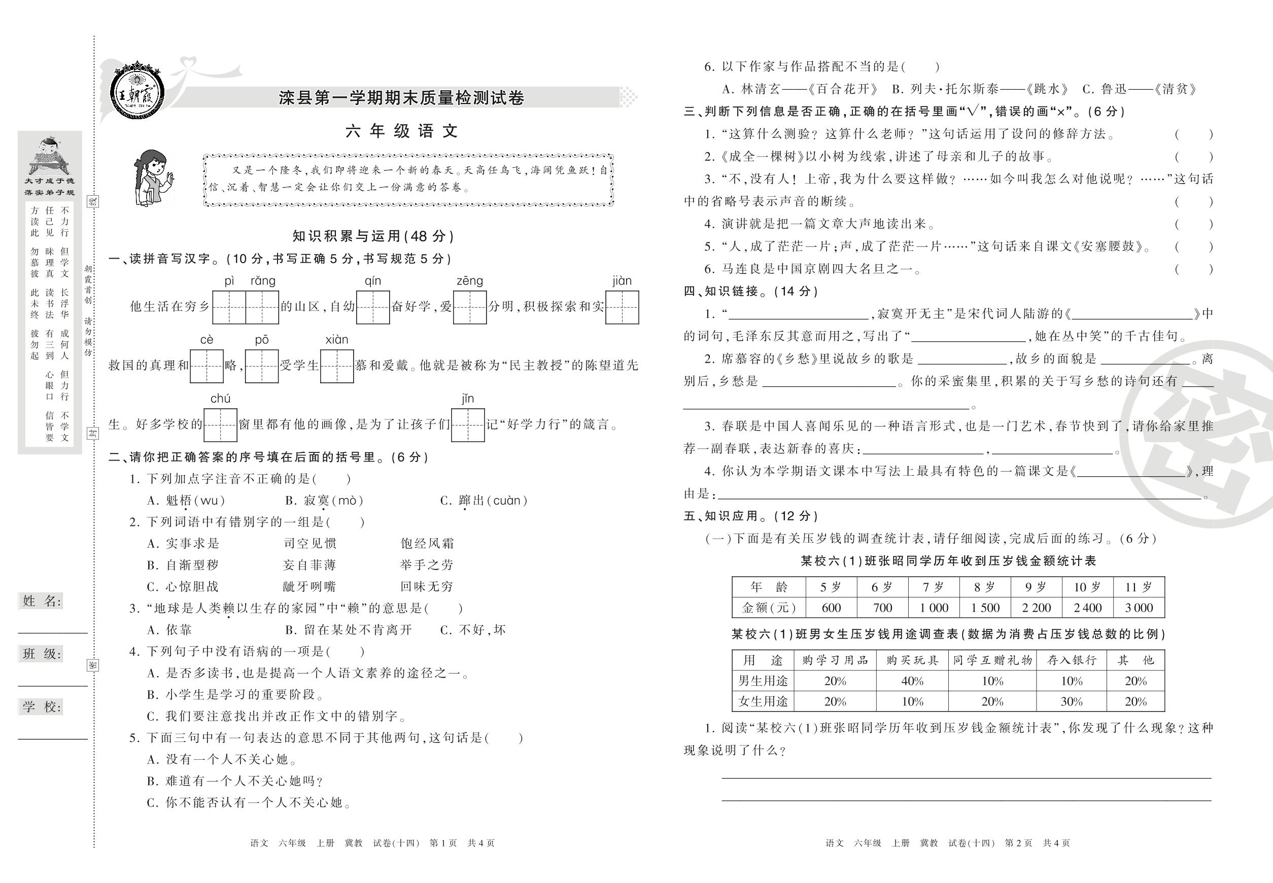 六年级语文冀教版上册期末卷