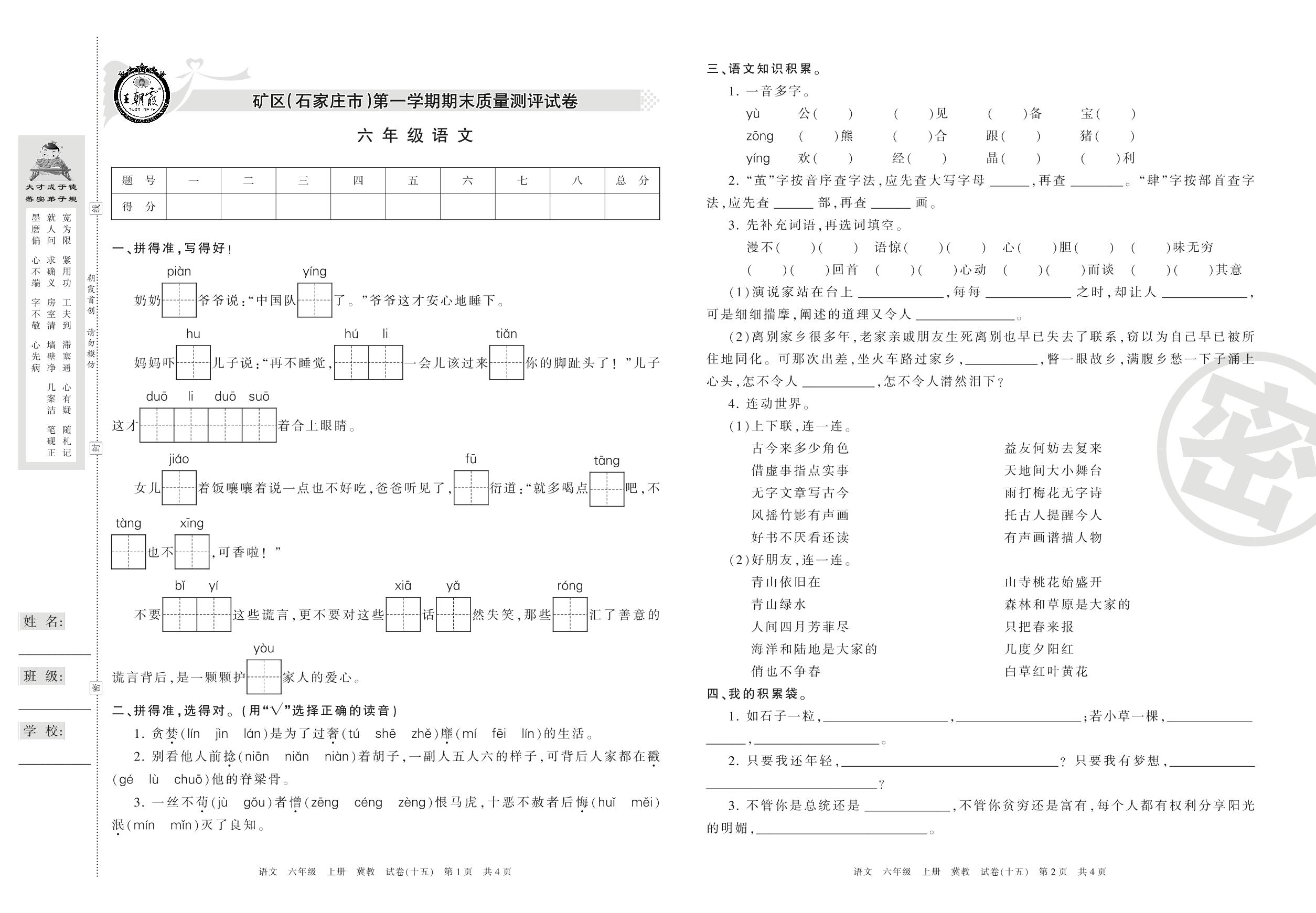 2016-2017学年第一学期矿区(石家庄市)六年级语文试卷(冀教版)【15】