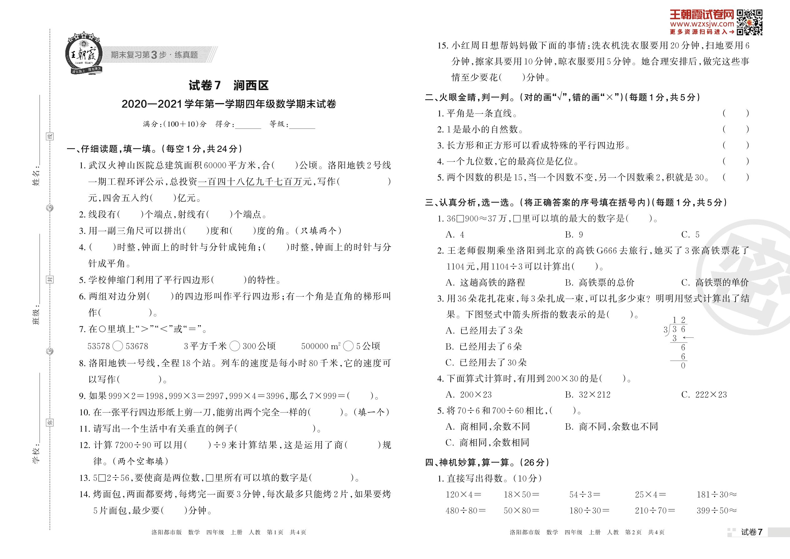 涧西区2020—2021学年第一学期四年级数学期末试卷(人教版)【7】