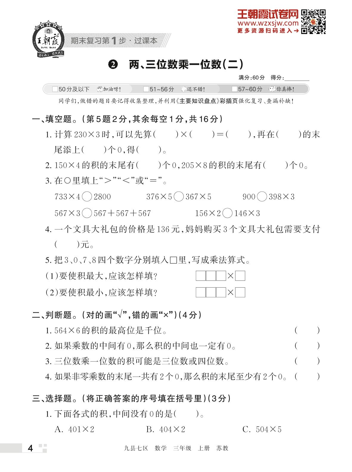 王朝霞期末过课本——2 两、三位数乘一位数(二)三年级上册数学(苏教版)