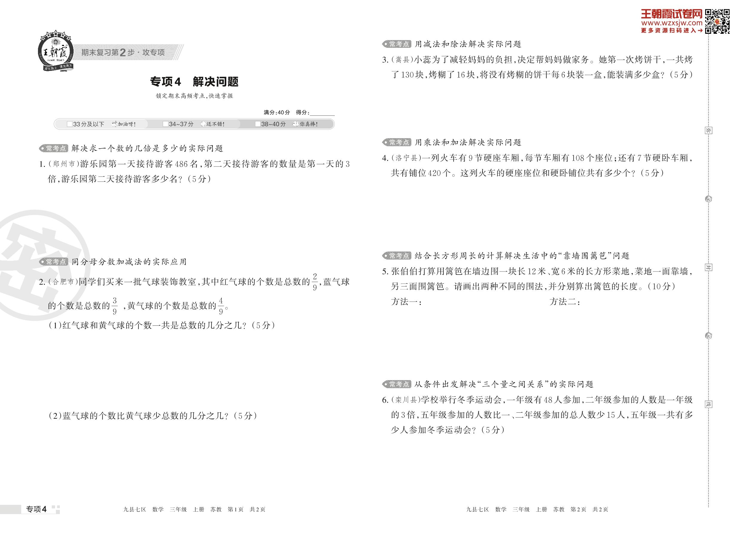 王朝霞期末专项卷——解决问题三年级上册数学(苏教版)【4】