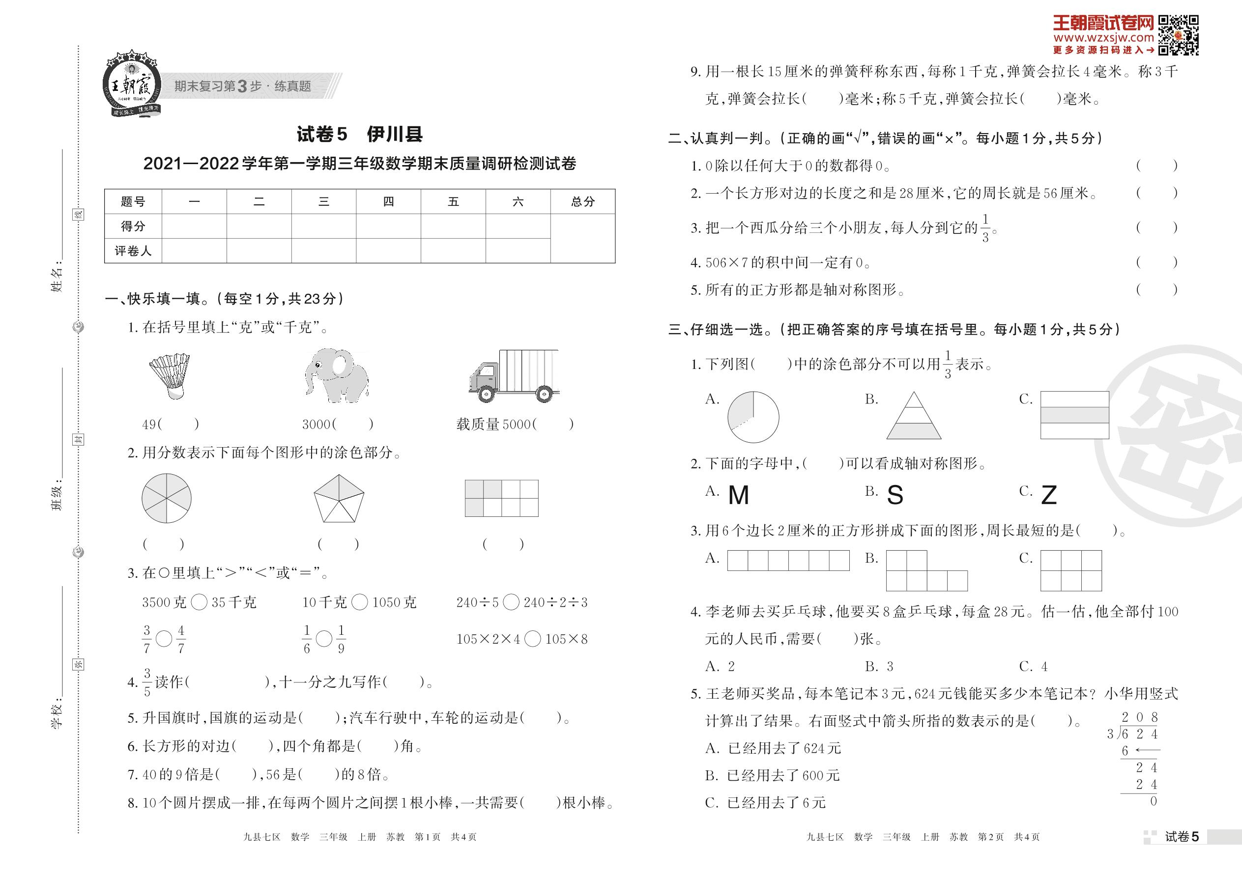 伊川县2021—2022学年第一学期三年级数学期末质量调研检测试卷(苏教版)【5】