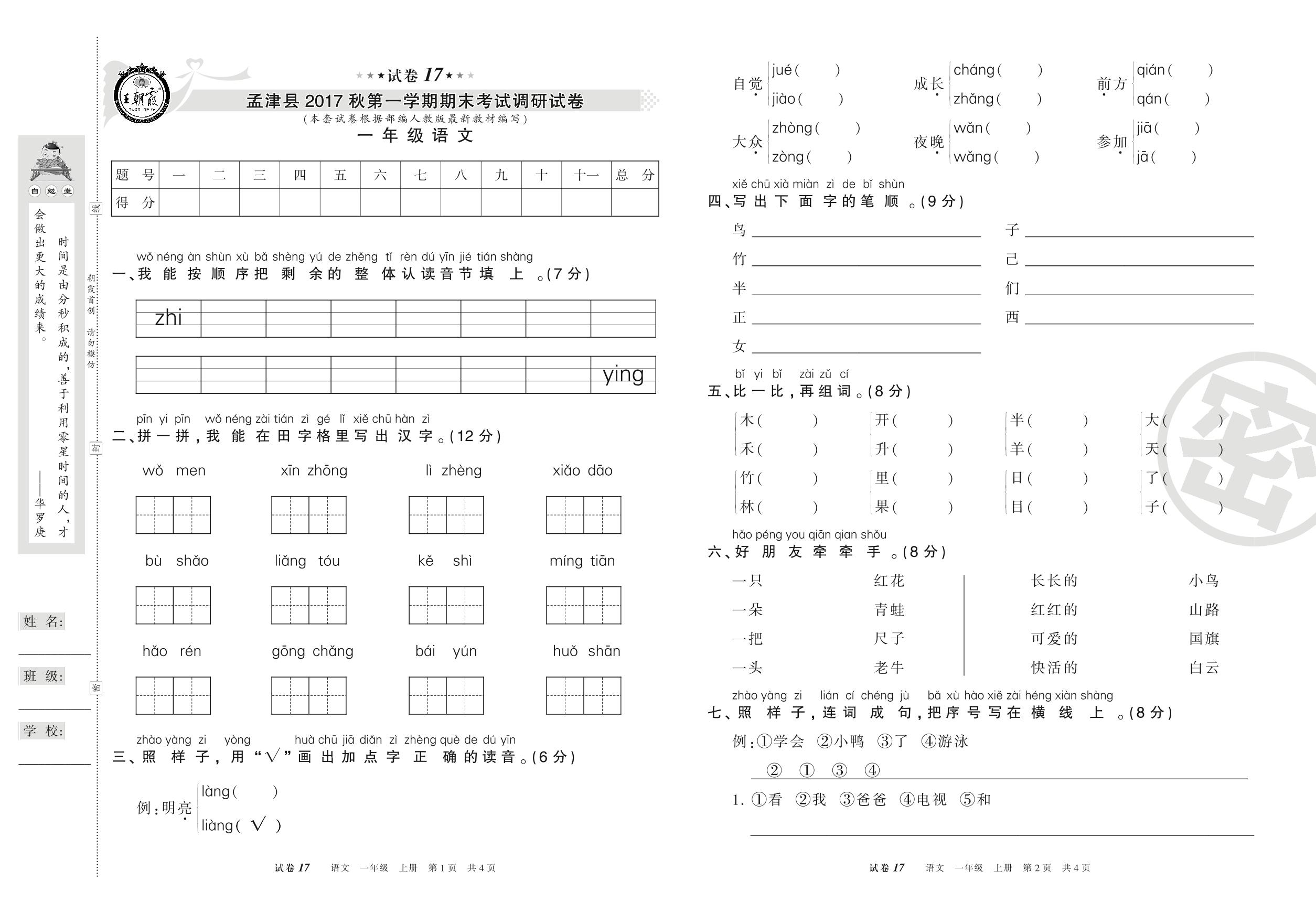 2016-2017学年第一学期洛阳市孟津县一年级语文试卷(人教版)【17】