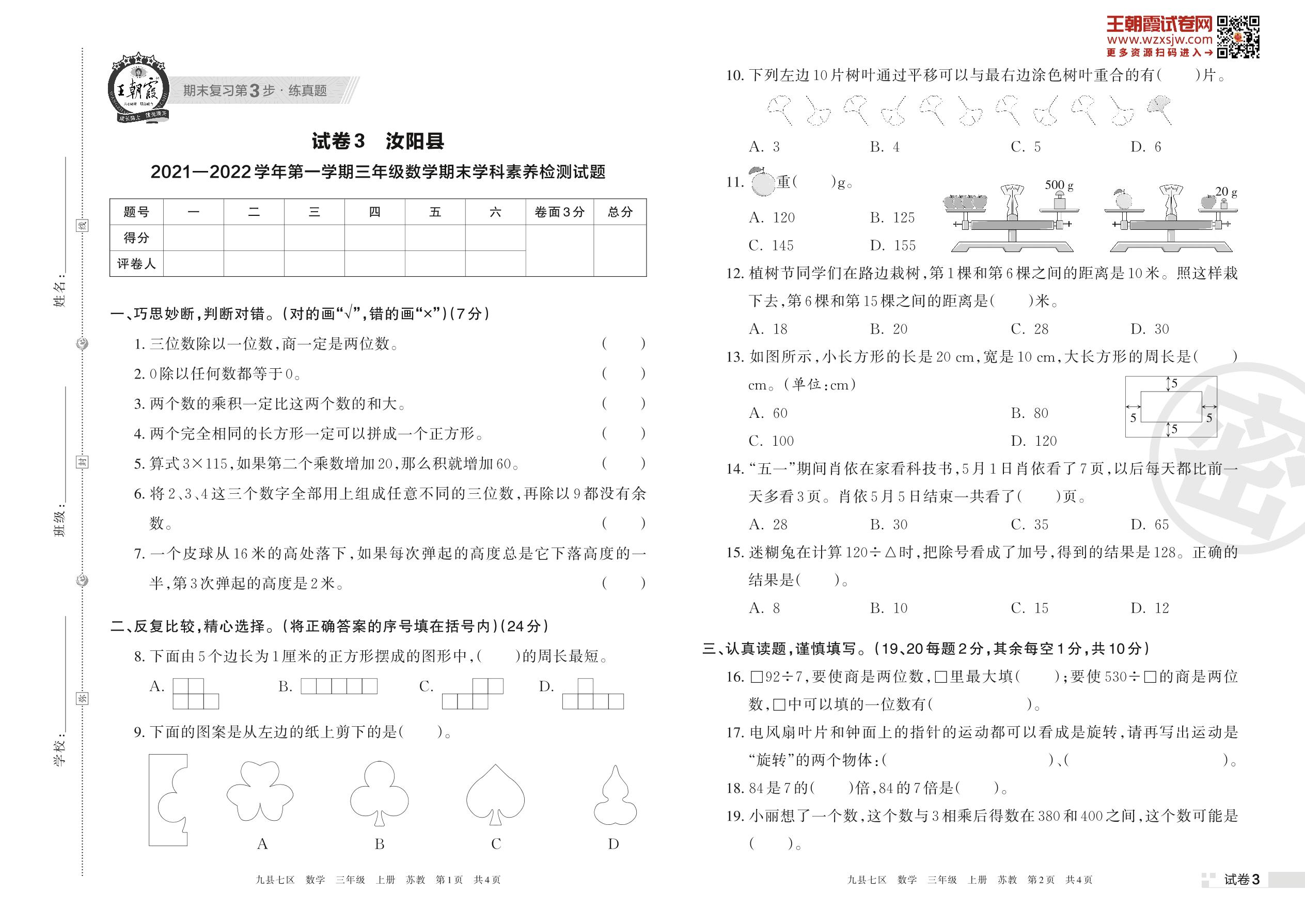 汝阳县2021—2022学年第一学期三年级数学期末学科素养检测试题(苏教版)【3】