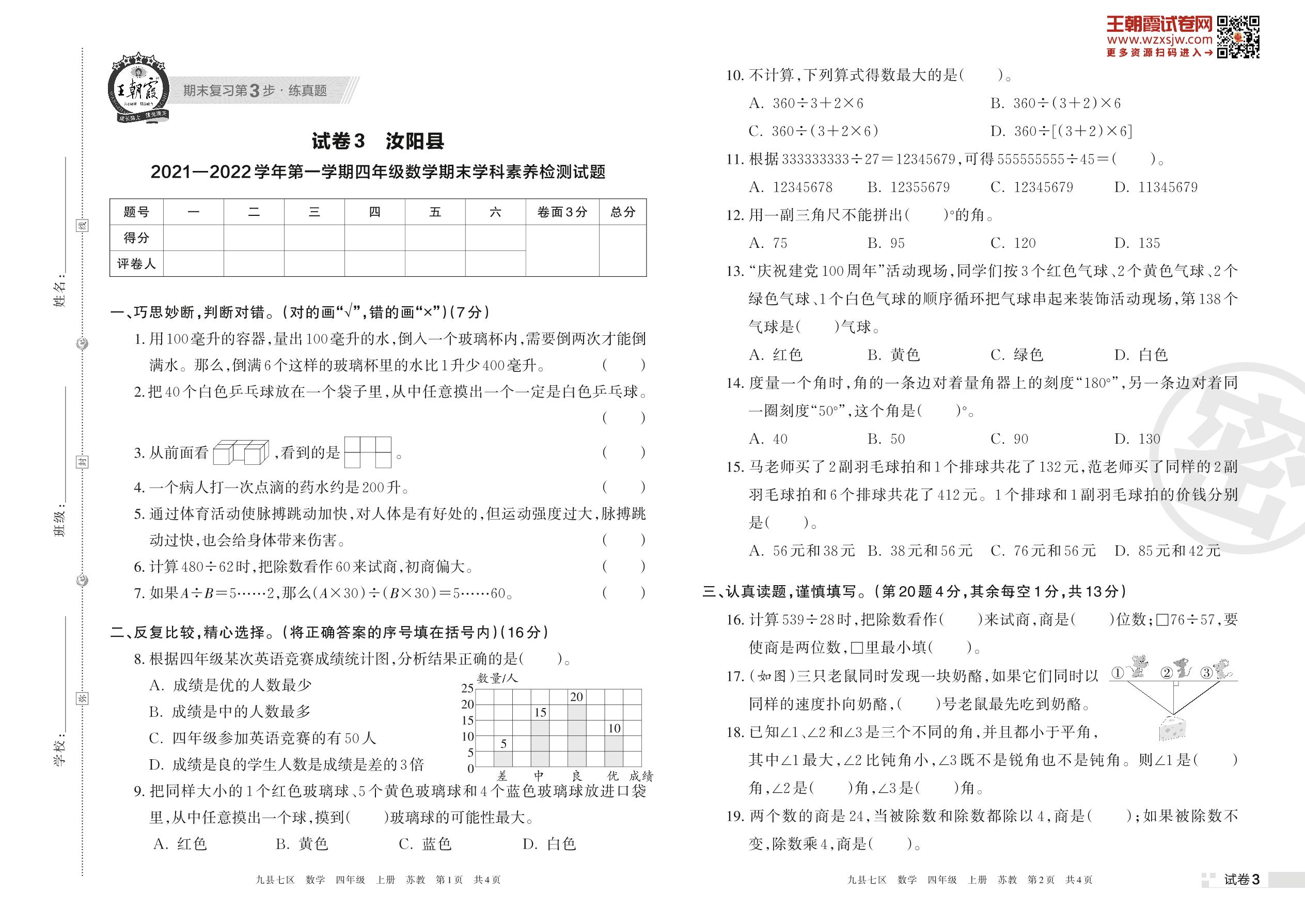 汝阳县2021—2022学年第一学期四年级数学期末学科素养检测试题(苏教版)【3】