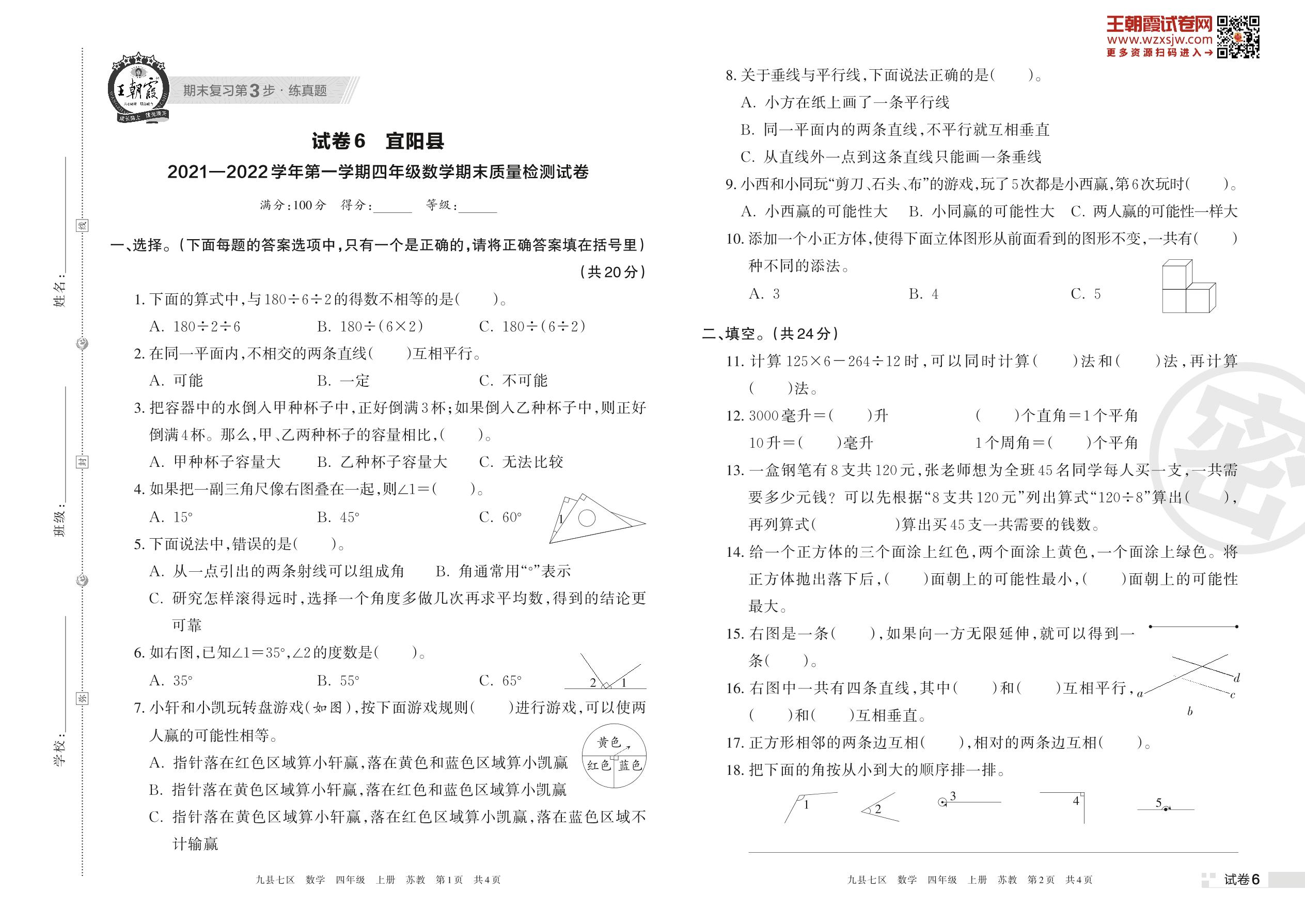 宜阳县2021—2022学年第一学期四年级数学期末质量检测试卷(苏教版)【6】