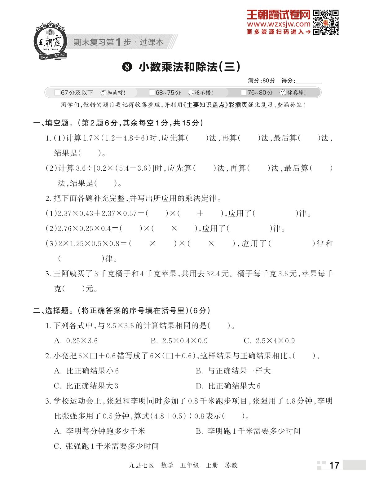 王朝霞期末过课本——8 小数乘法和除法(三)五年级上册数学(苏教版)