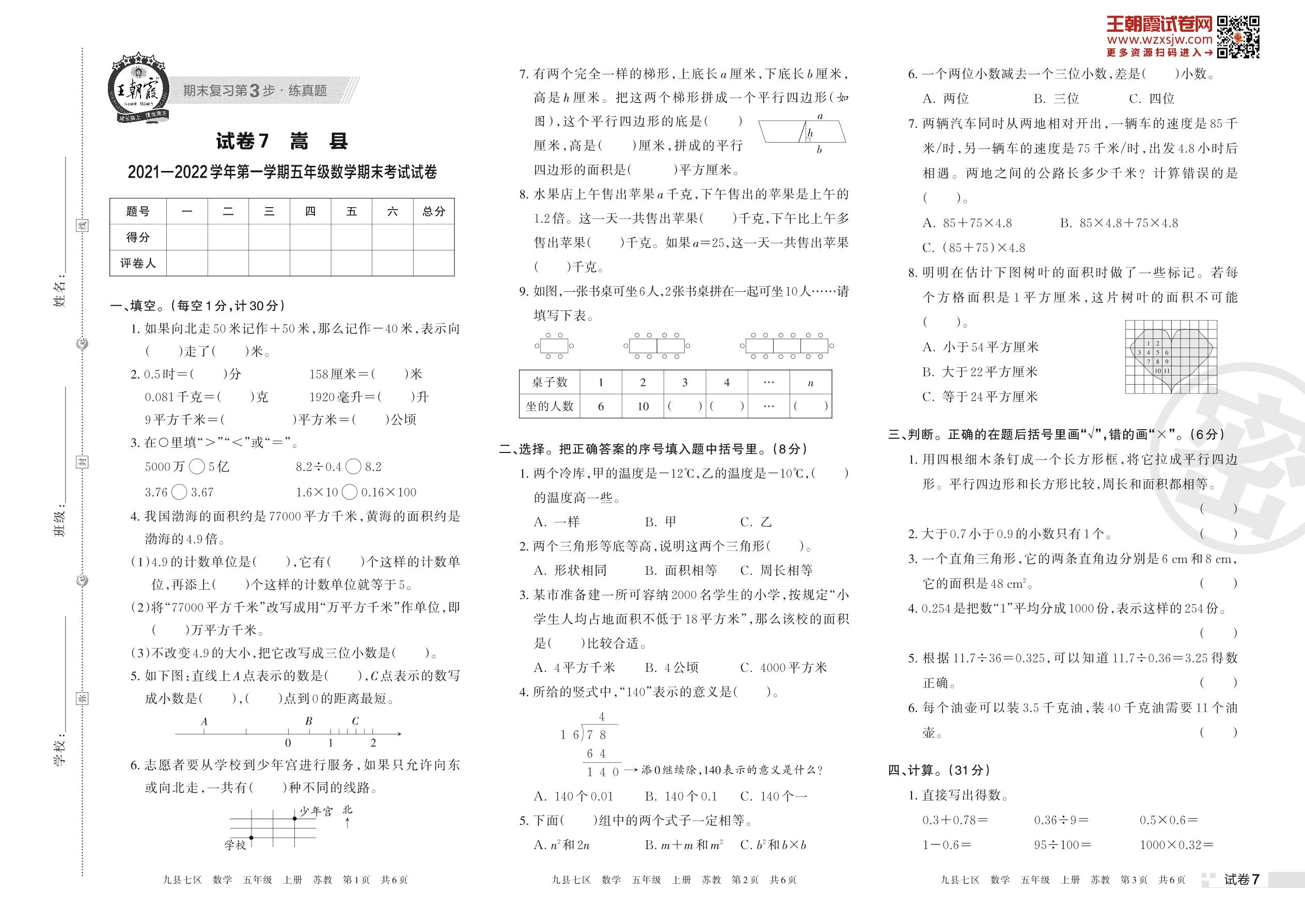 嵩县2021—2022学年第一学期五年级数学期末考试试卷 (苏教版)【7】