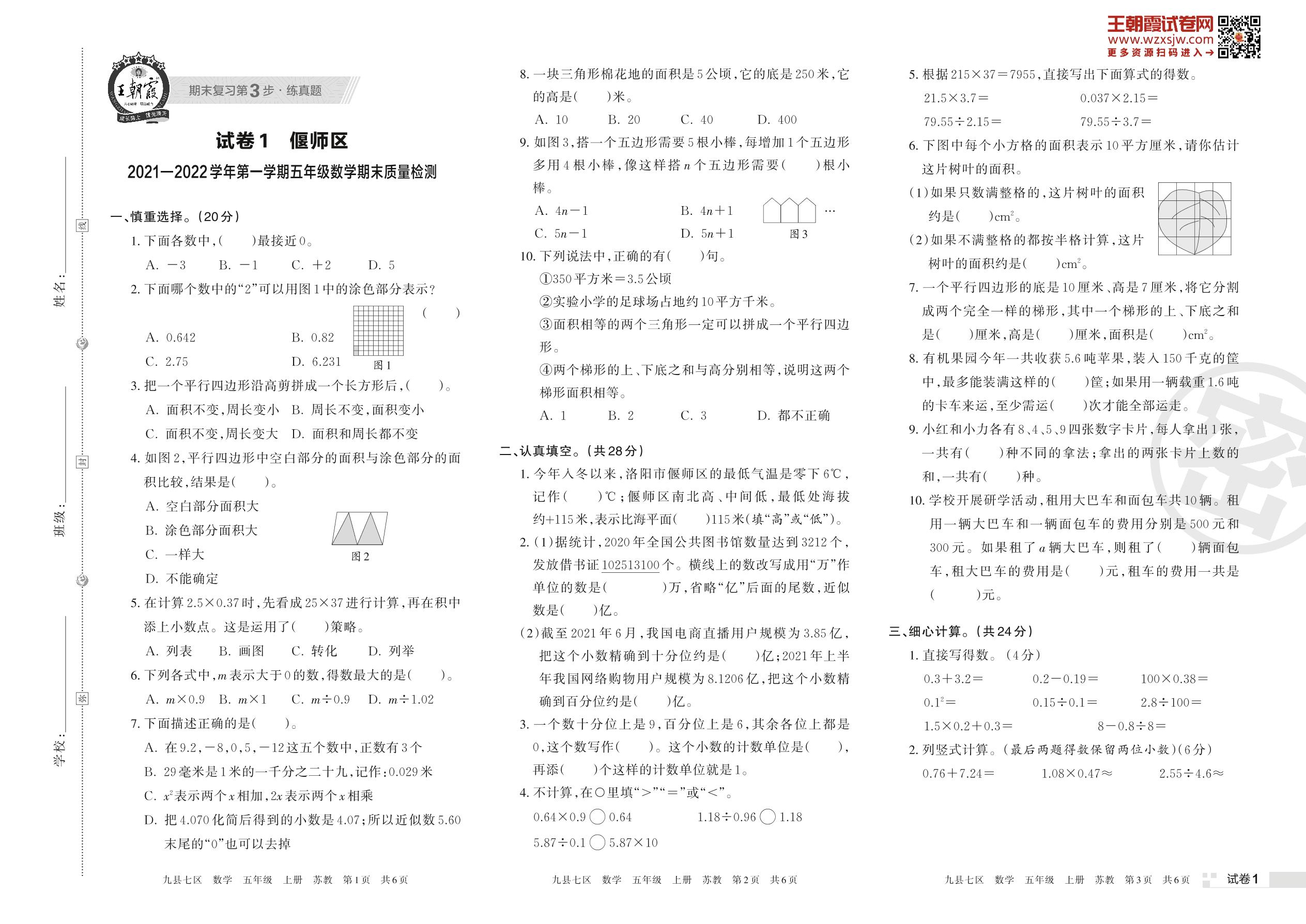 偃师区2021—2022学年第一学期五年级数学期末质量检测(苏教版)【1】