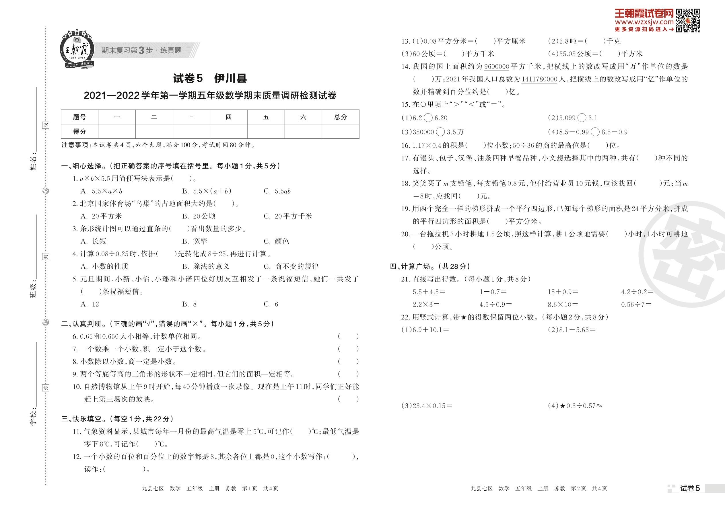 伊川县2021—2022学年第一学期五年级数学期末质量调研检测试卷(苏教版)【5】