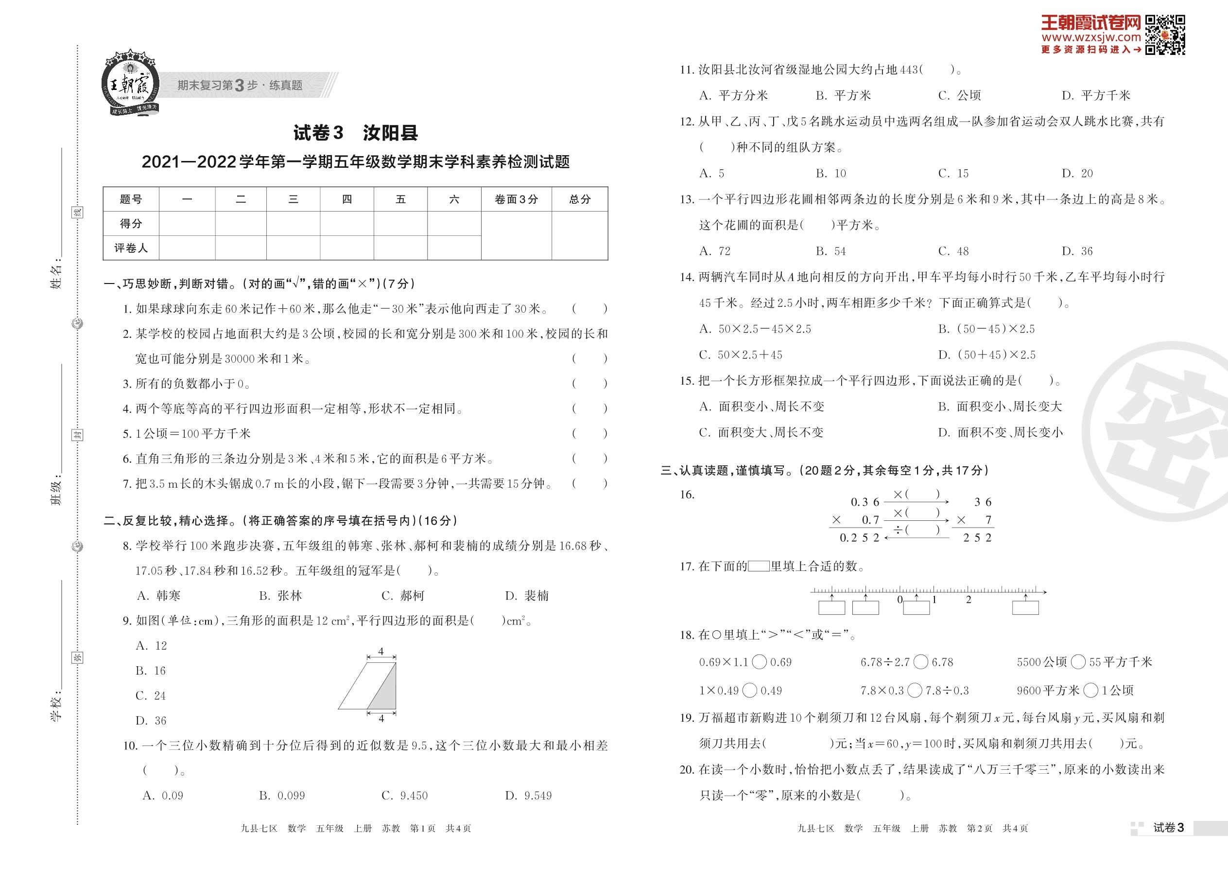 汝阳县2021—2022学年第一学期五年级数学期末学科素养检测试题(苏教版)【3】