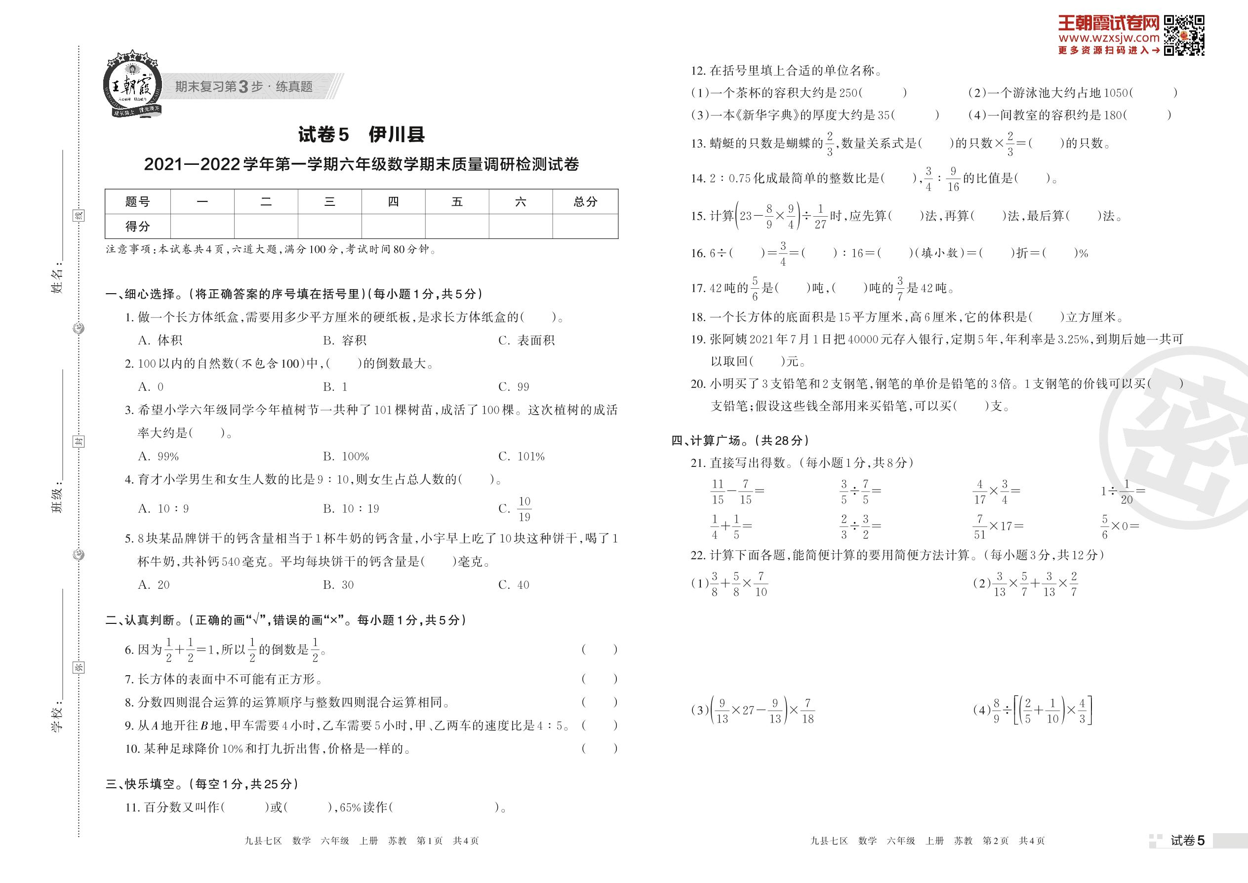 伊川县2021—2022学年第一学期六年级数学期末质量调研检测试卷(苏教版)【5】
