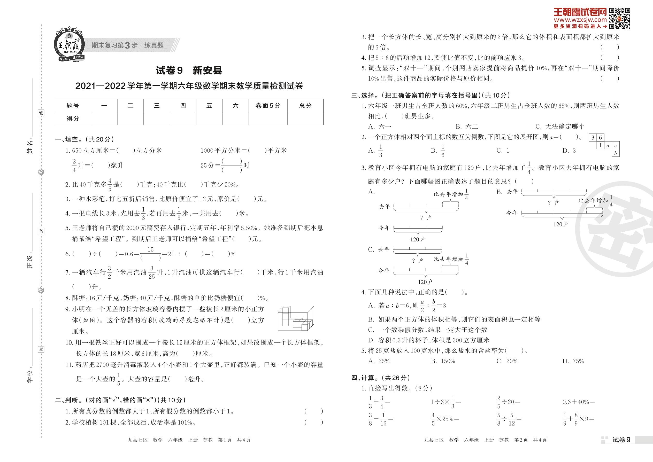 新安县2021—2022学年第一学期六年级数学期末教学质量检测试卷(苏教版)【9】