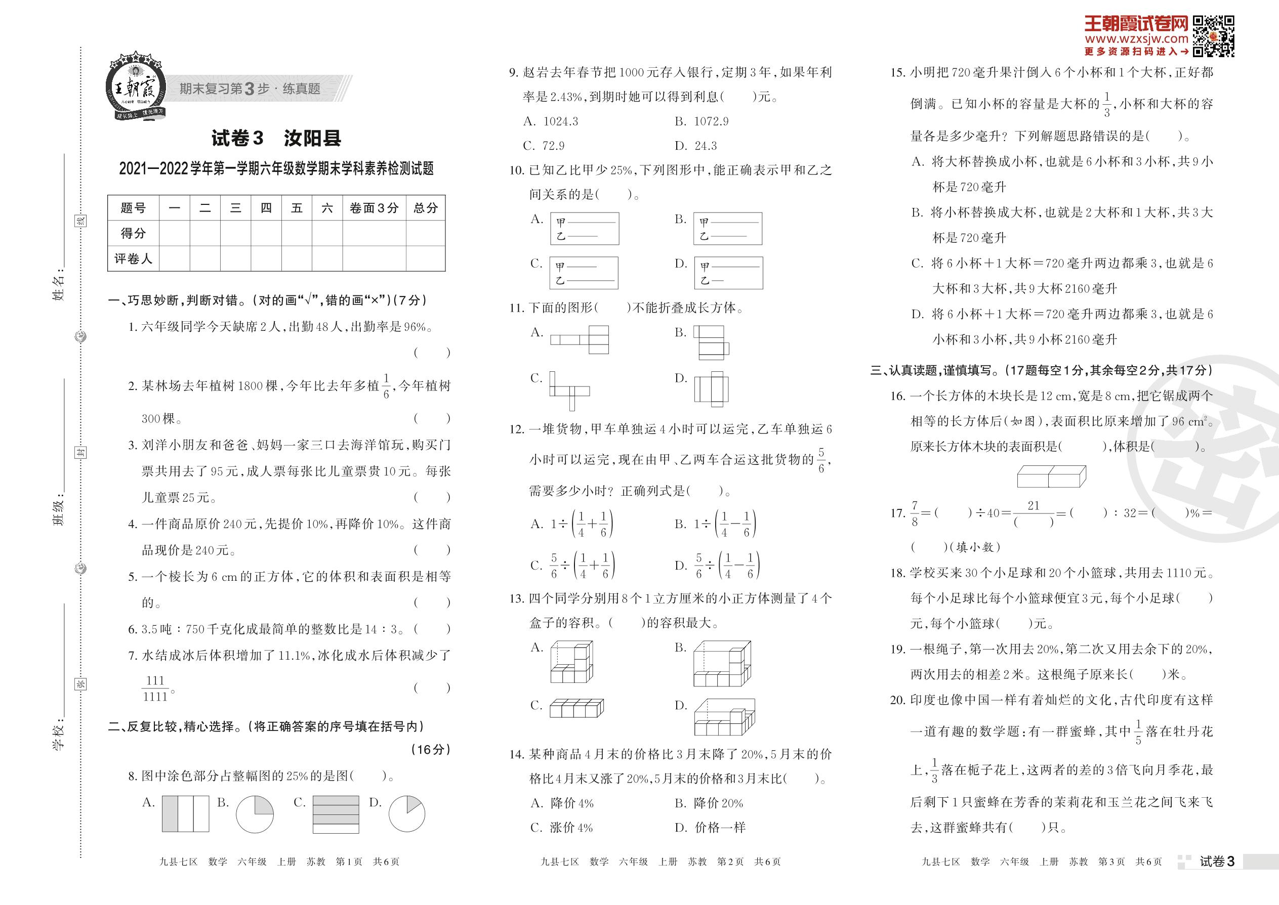 汝阳县2021—2022学年第一学期六年级数学期末学科素养检测试题(苏教版)【3】