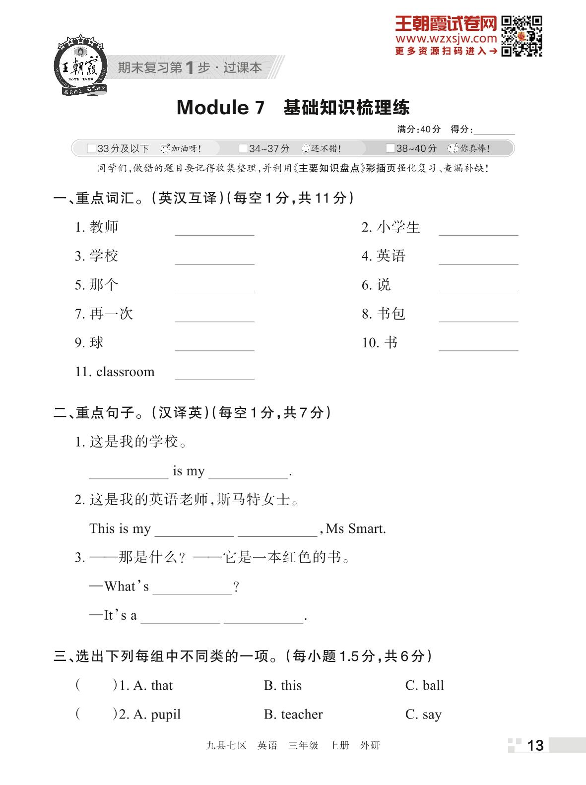 王朝霞期末过课本——Module 7 基础知识梳理练三年级上册英语(外研版)