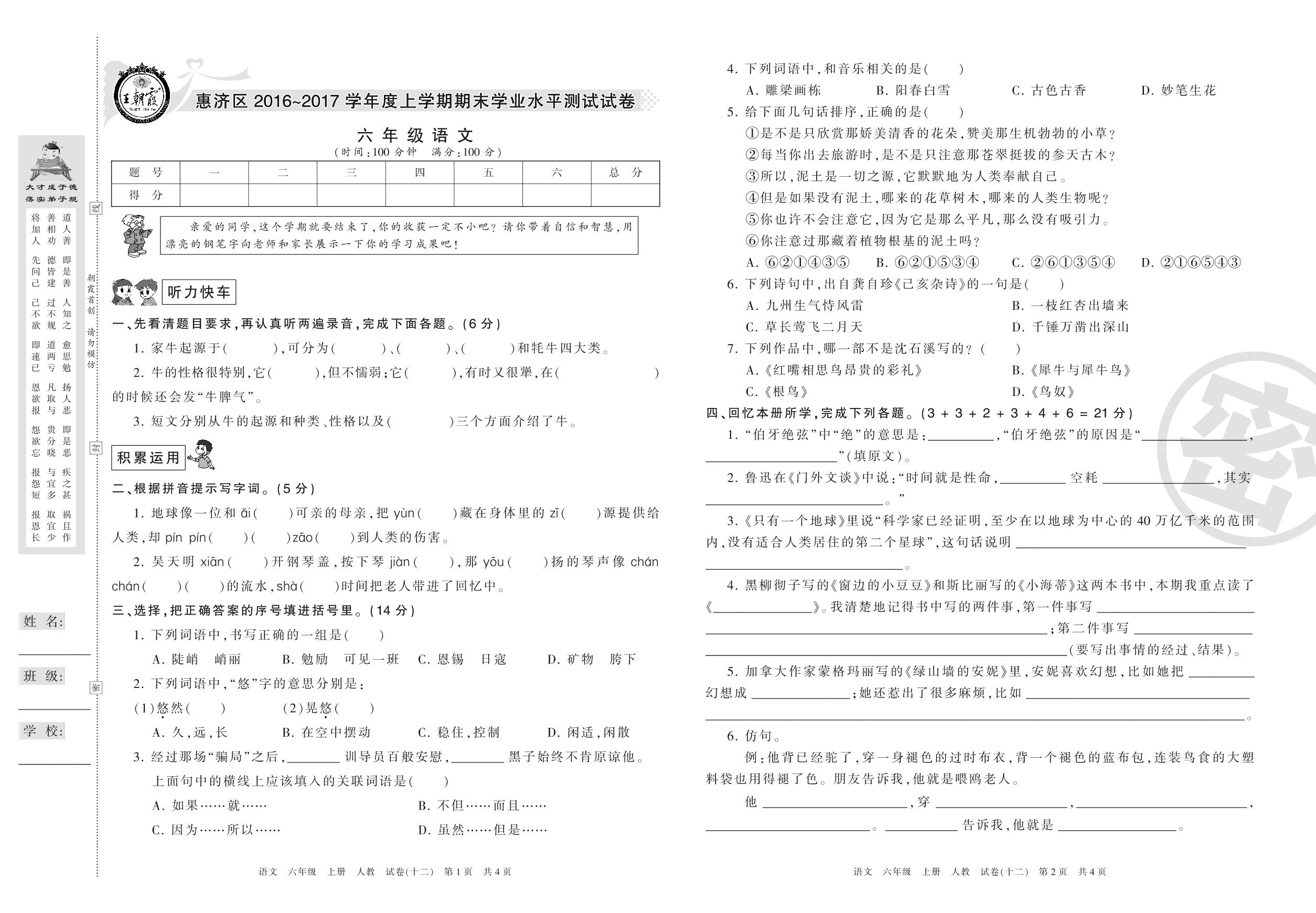 2016-2017学年第一学期郑州市郑汴专版惠济区六年级语文试卷(人教版)【12】