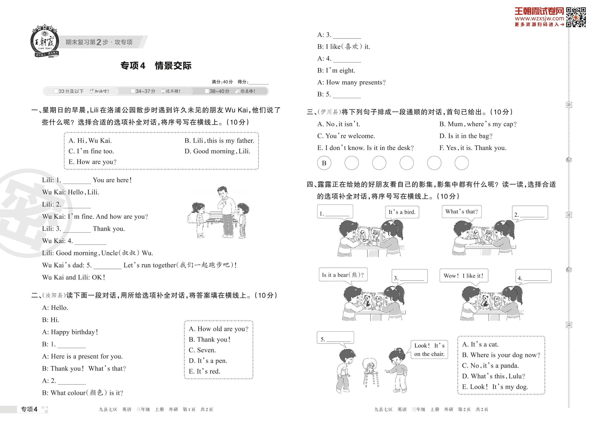 王朝霞期末专项卷——情景交际三年级上册英语(外研版)【4】