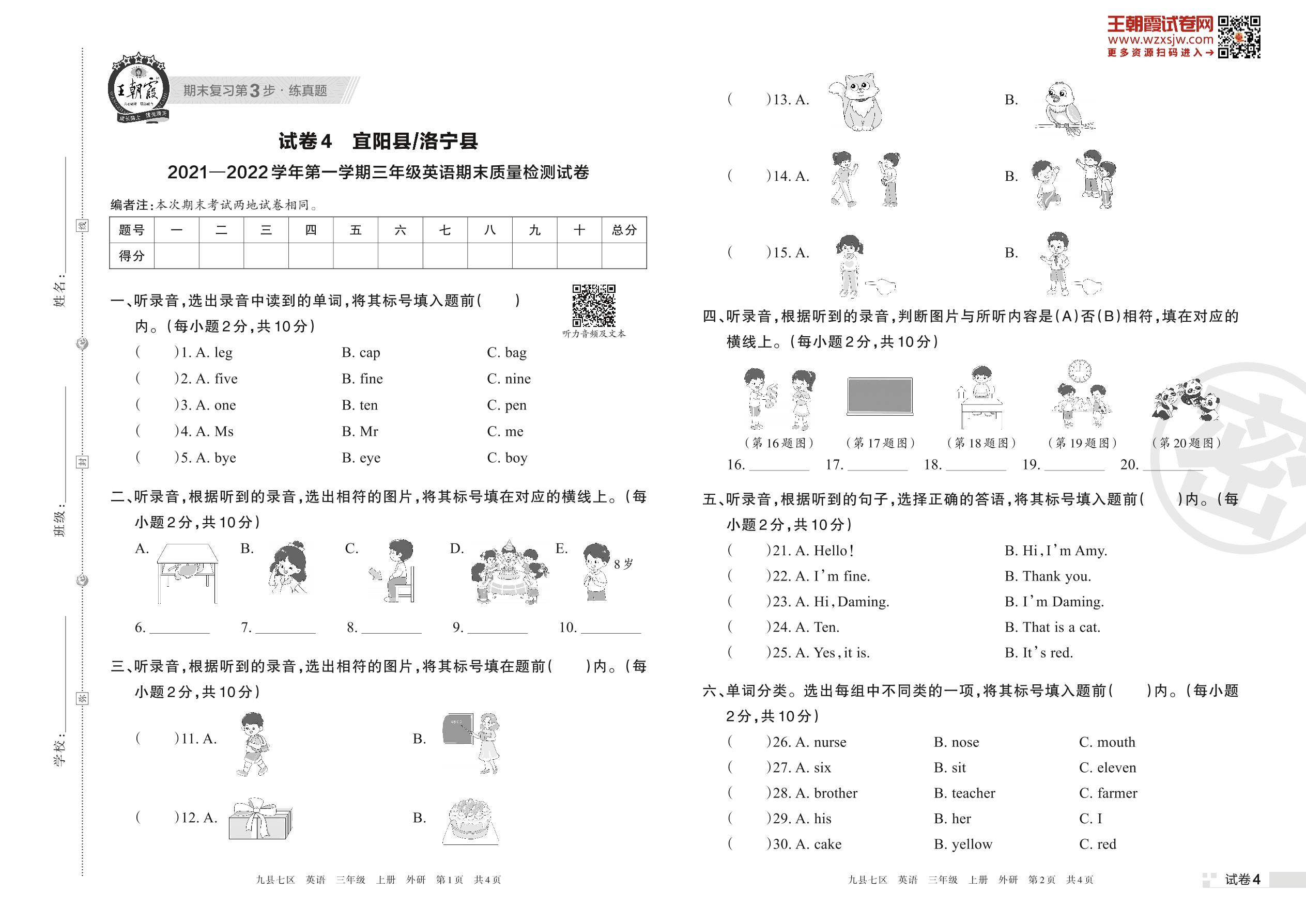 宜阳县、洛宁县2021—2022学年第一学期三年级英语期末质量检测试卷(外研版)【4】