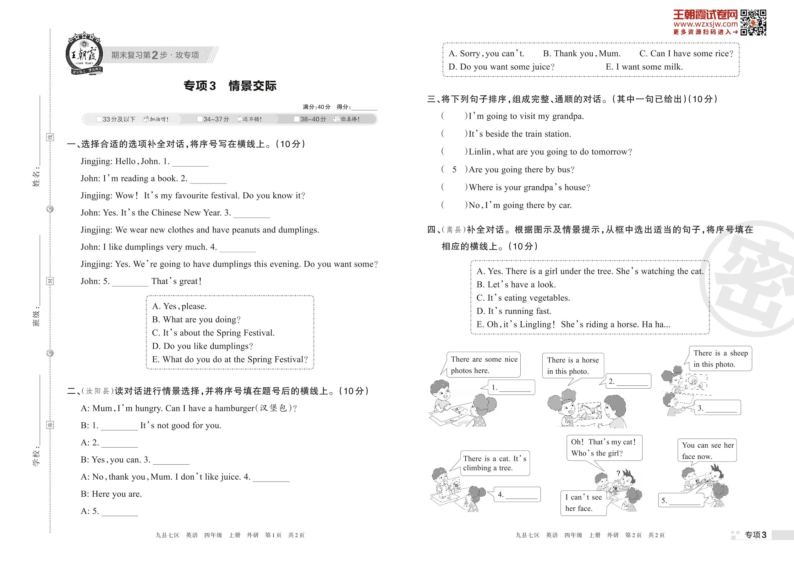 王朝霞期末专项卷——情景交际四年级上册英语(外研版)【3】