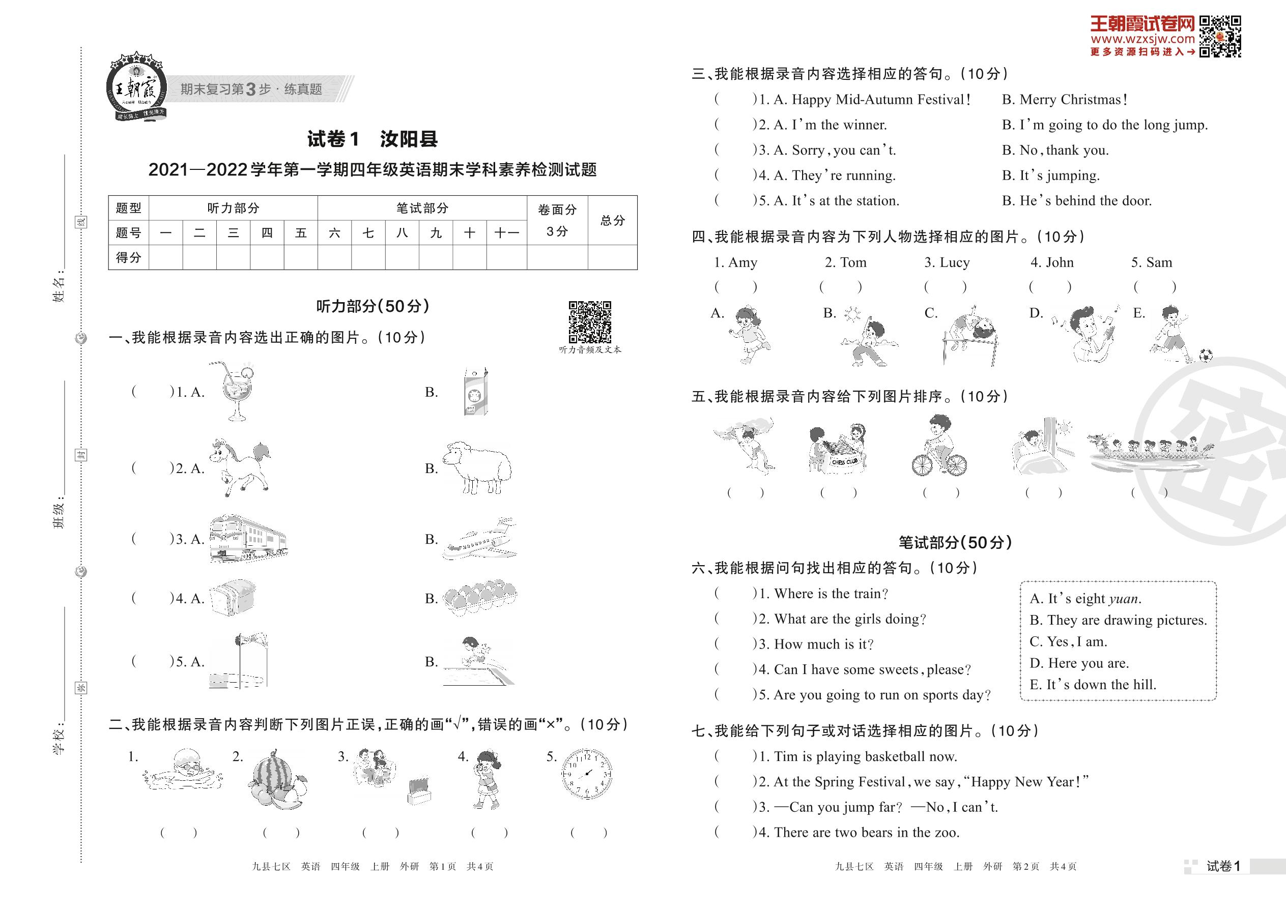 汝阳县2021—2022学年第一学期四年级英语期末学科素养检测试题(外研版)【1】
