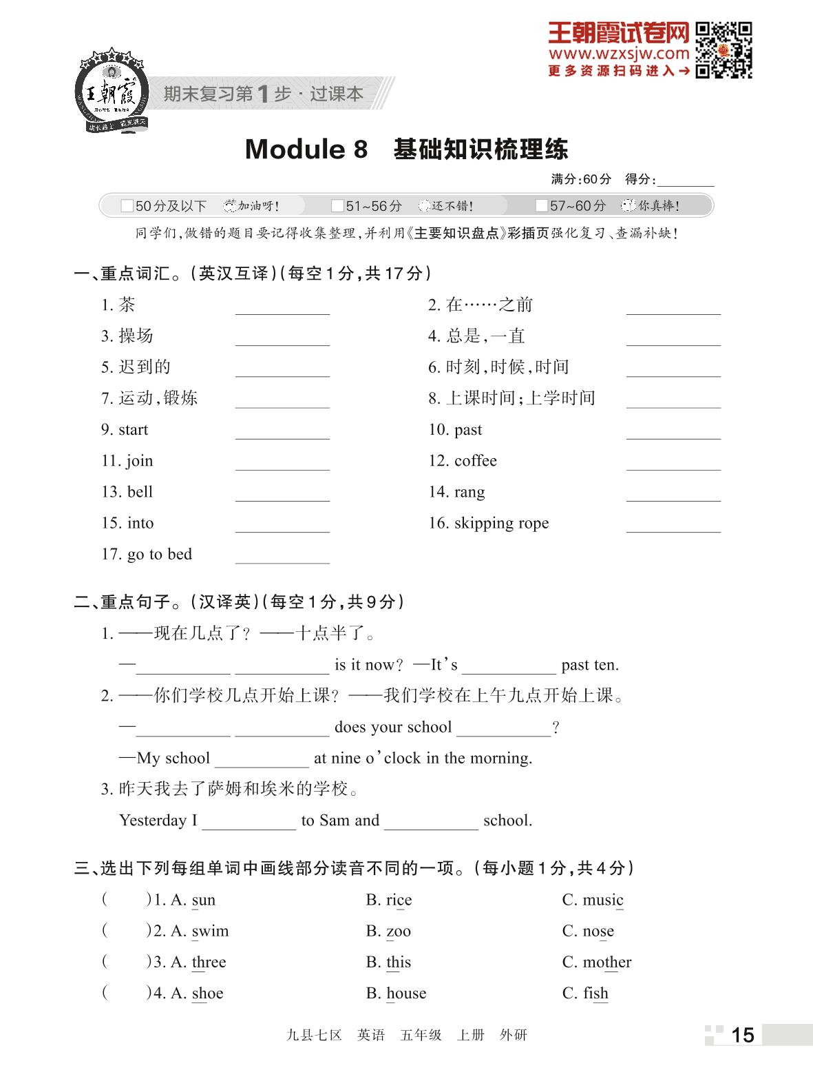王朝霞期末过课本——Module 8 基础知识梳理练五年级上册英语(外研版)