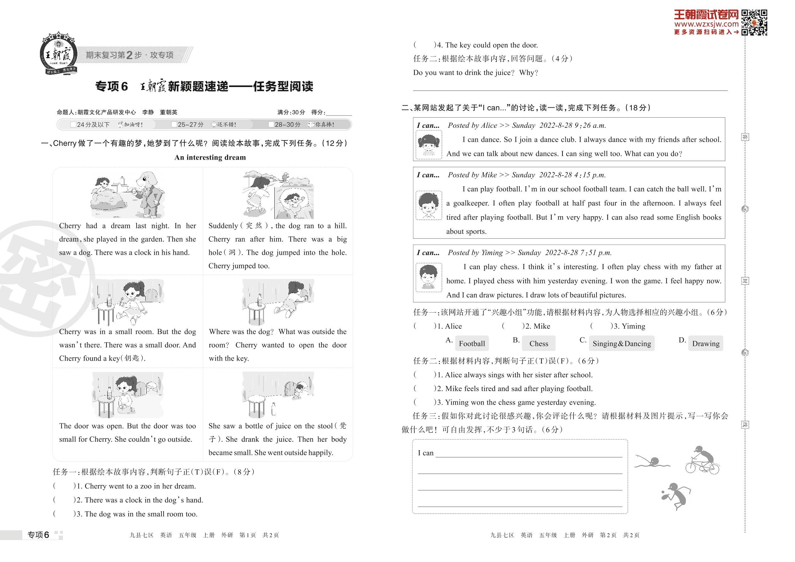 王朝霞期末专项卷——书面表达五年级上册英语(外研版)【5】
