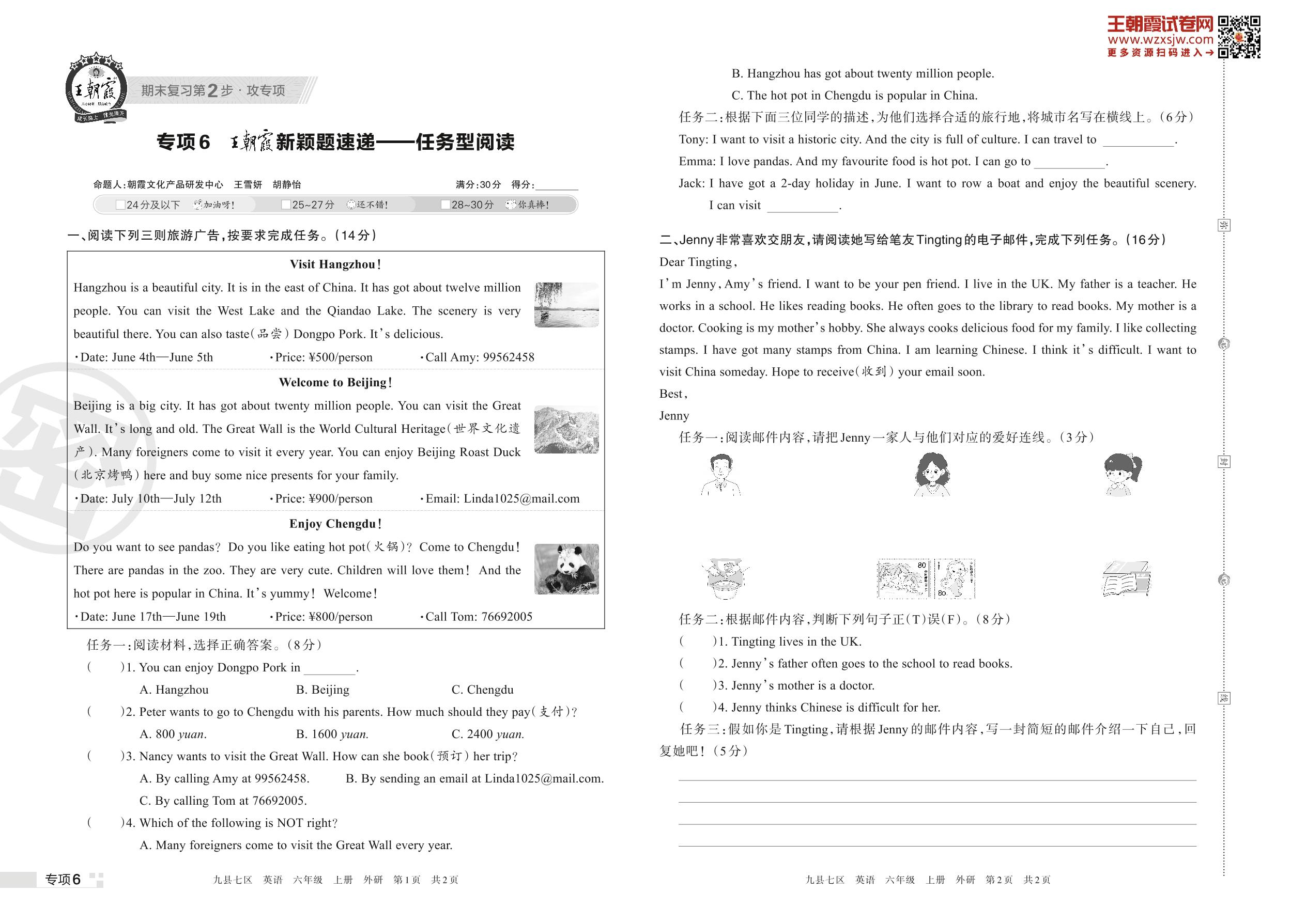 王朝霞期末专项卷——王朝霞新颖题速递:任务型阅读六年级上册英语(外研版)【6】