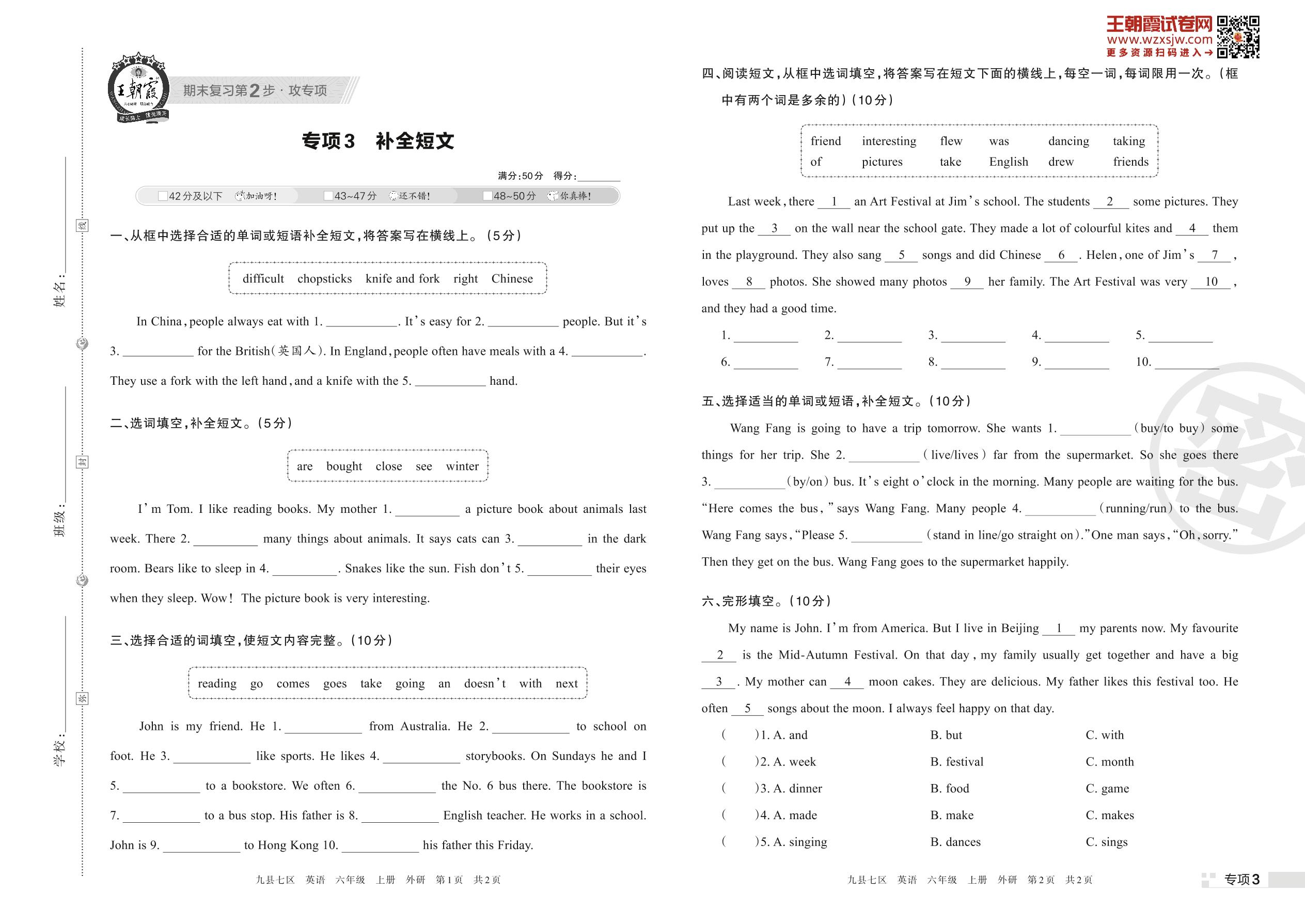 王朝霞期末专项卷——补全短文六年级上册英语(外研版)【3】