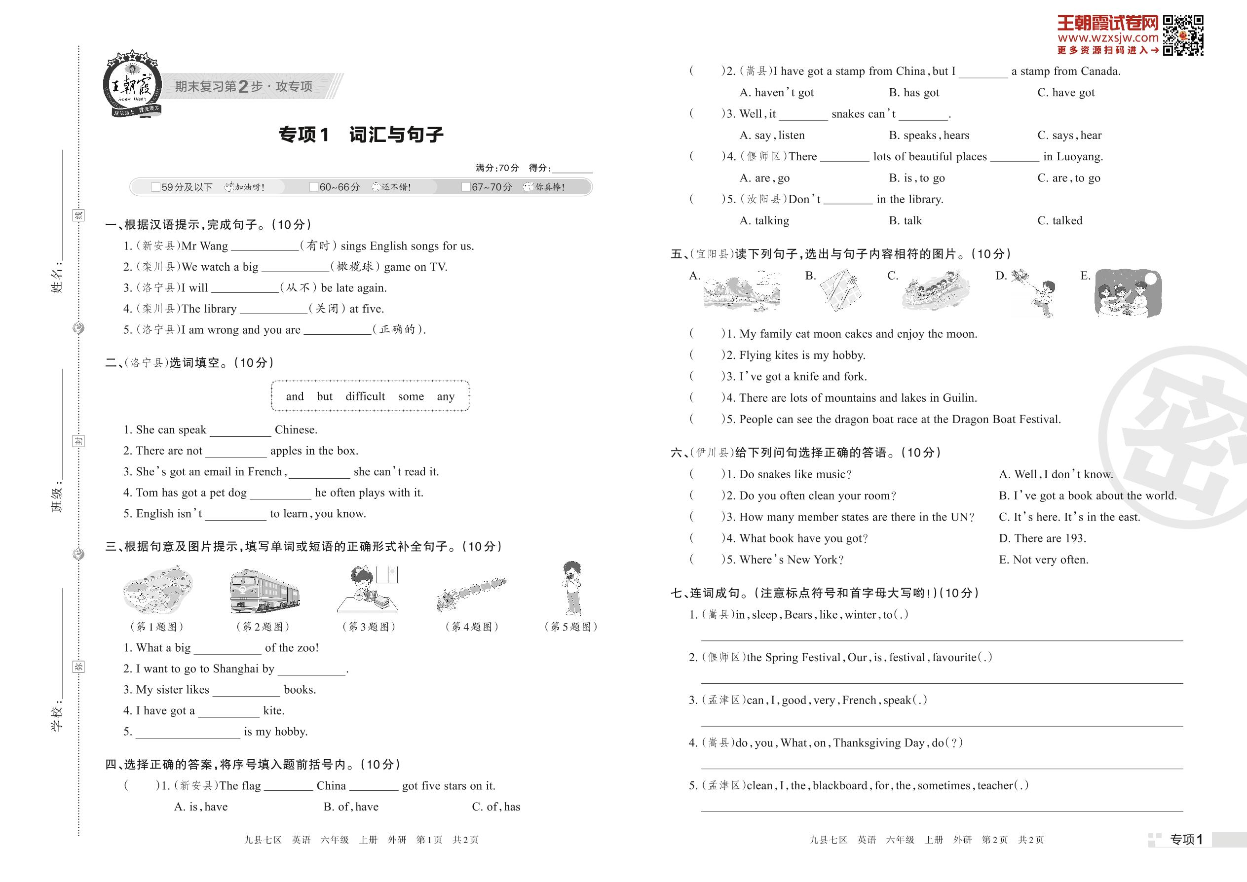 王朝霞期末专项卷——词汇与句子六年级上册英语(外研版)【1】