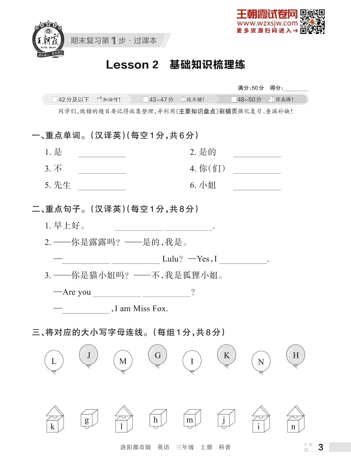 王朝霞期末过课本——Lesson 2 基础知识梳理练三年级上册英语(科普版)