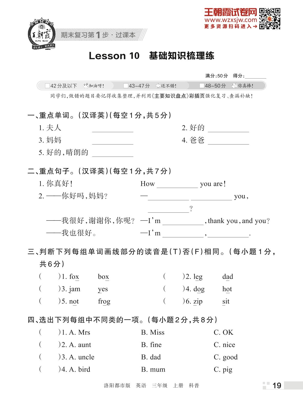 王朝霞期末过课本——Lesson 10 基础知识梳理练三年级上册英语(科普版)