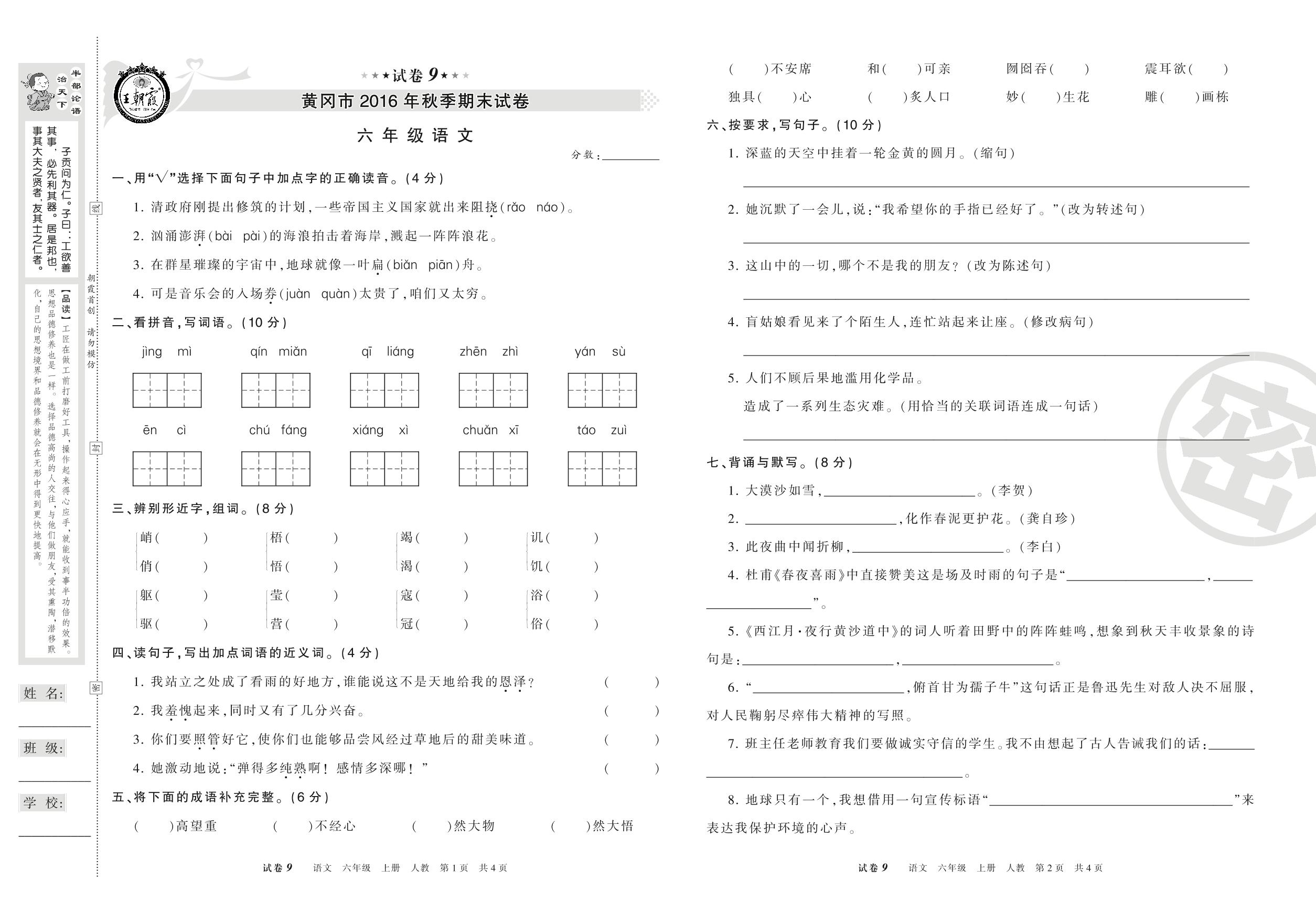 2016-2017学年第一学期黄冈市六年级语文试卷(人教版)【9】