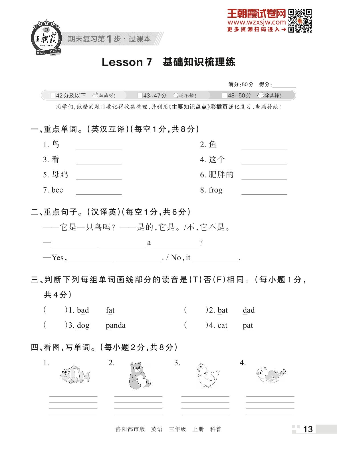 王朝霞期末过课本——Lesson 7 基础知识梳理练三年级上册英语(科普版)