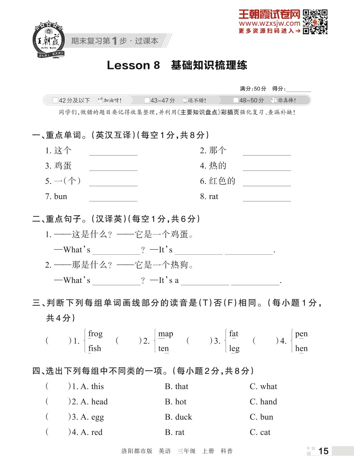 王朝霞期末过课本——Lesson 8 基础知识梳理练三年级上册英语(科普版)