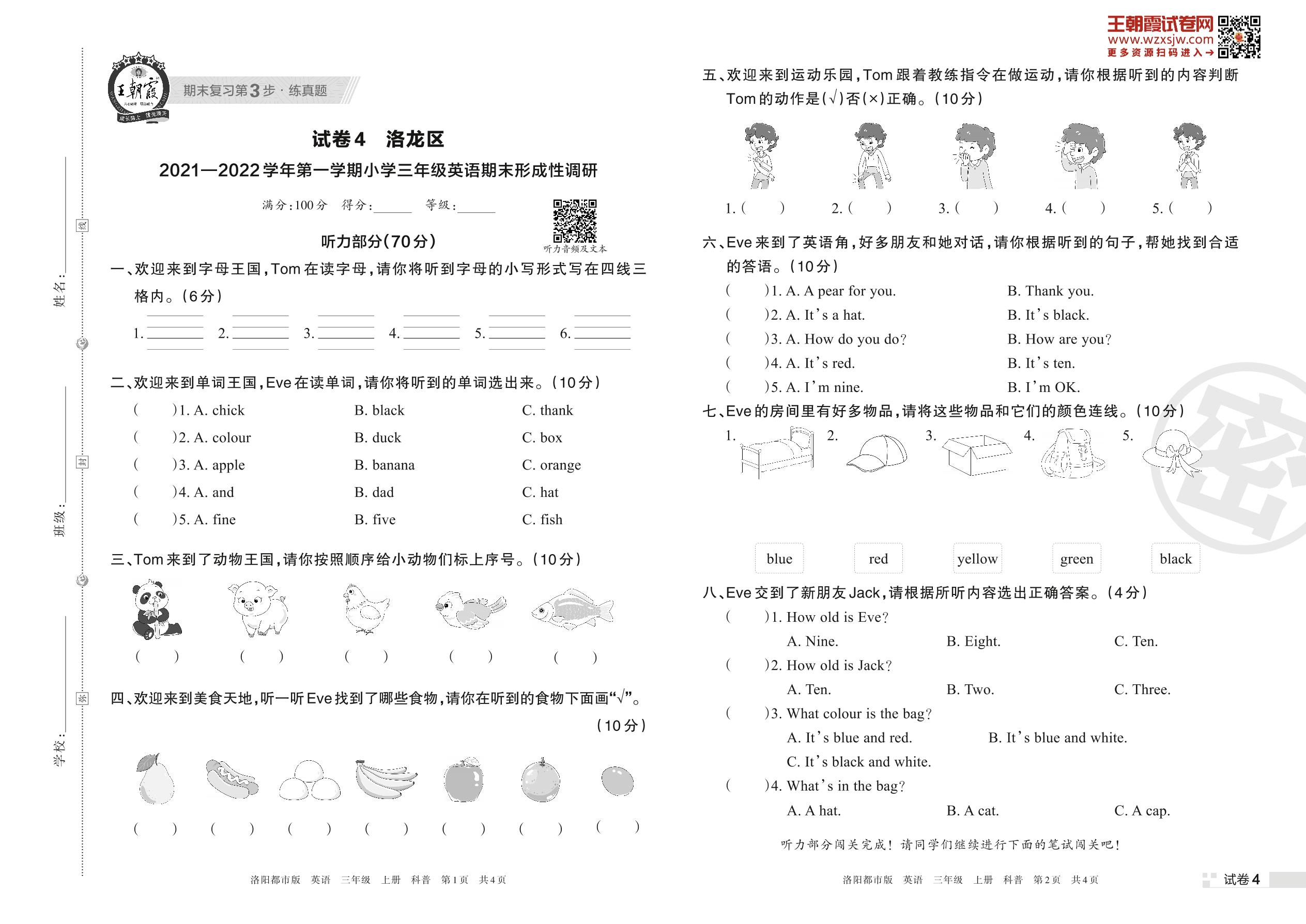 洛龙区2021—2022学年第一学期小学三年级英语期末形成性调研(科普版)【4】