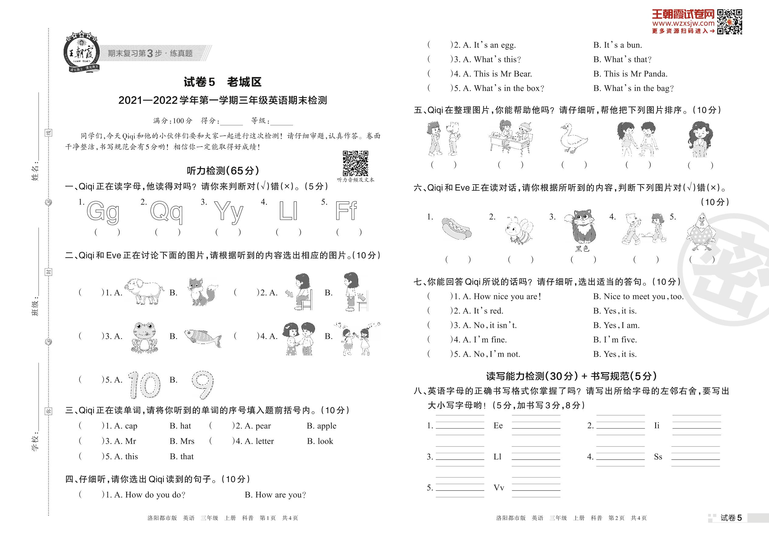 老城区2021—2022学年第一学期三年级英语期末检测(科普版)【5】
