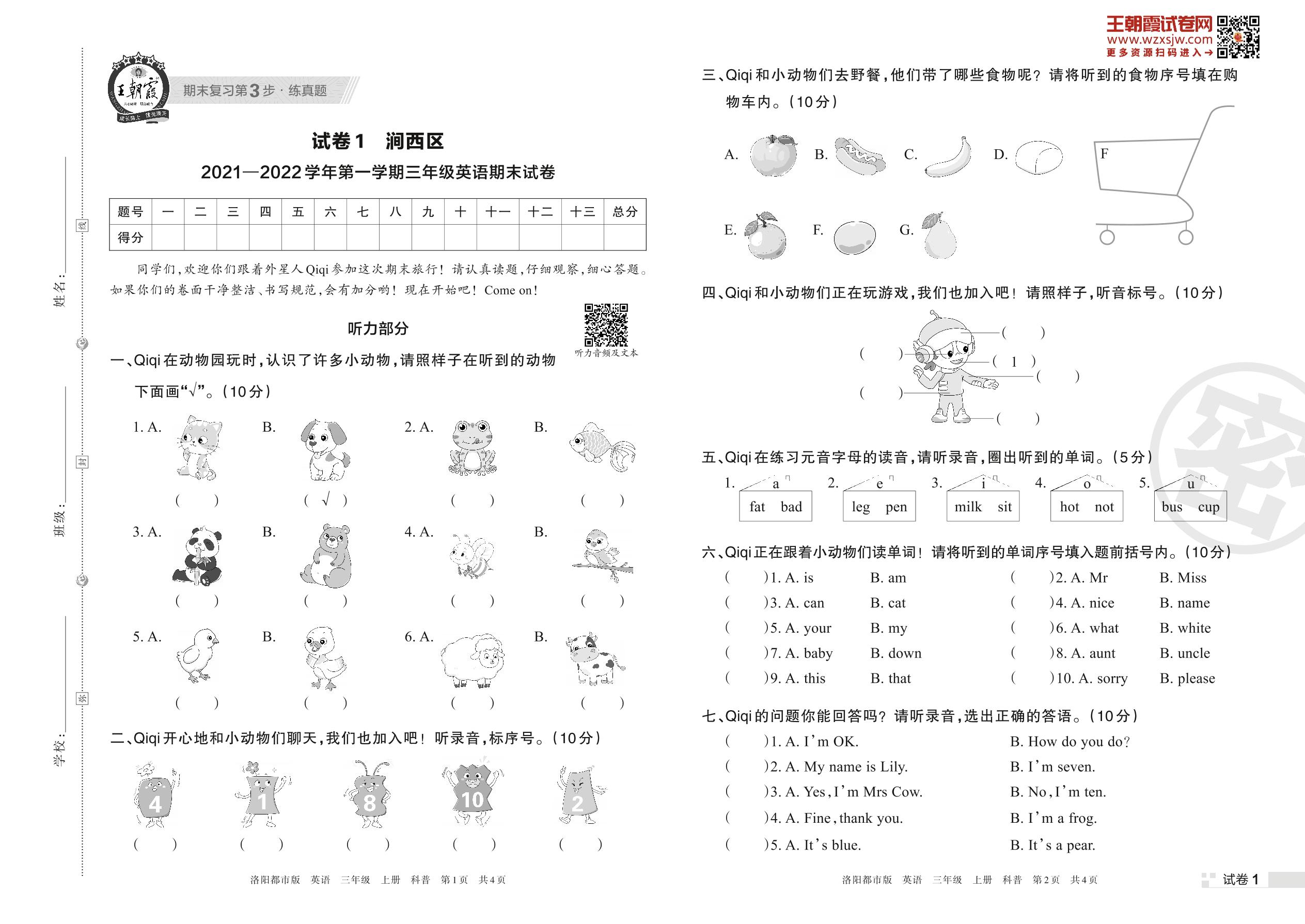 涧西区2021—2022学年第一学期三年级英语期末试卷(科普版)【1】