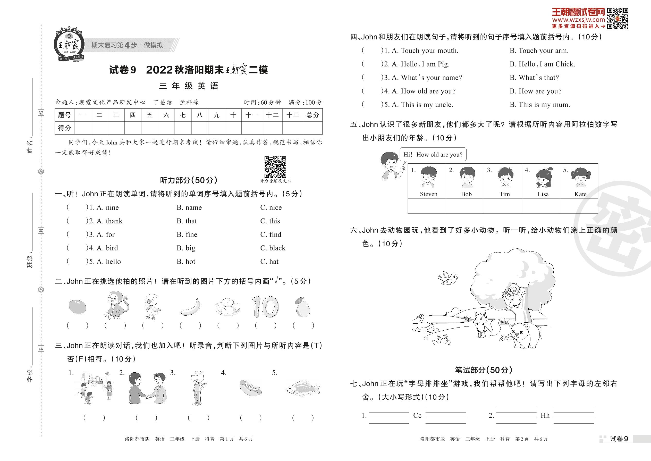 王朝霞期末模拟卷三年级上册英语(科普版)_R221111103659417【9】
