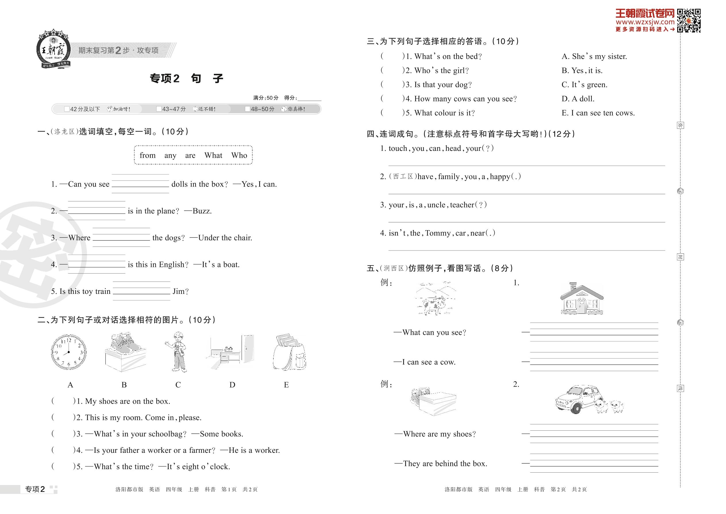 王朝霞期末专项卷——句子四年级上册英语(科普版)【2】