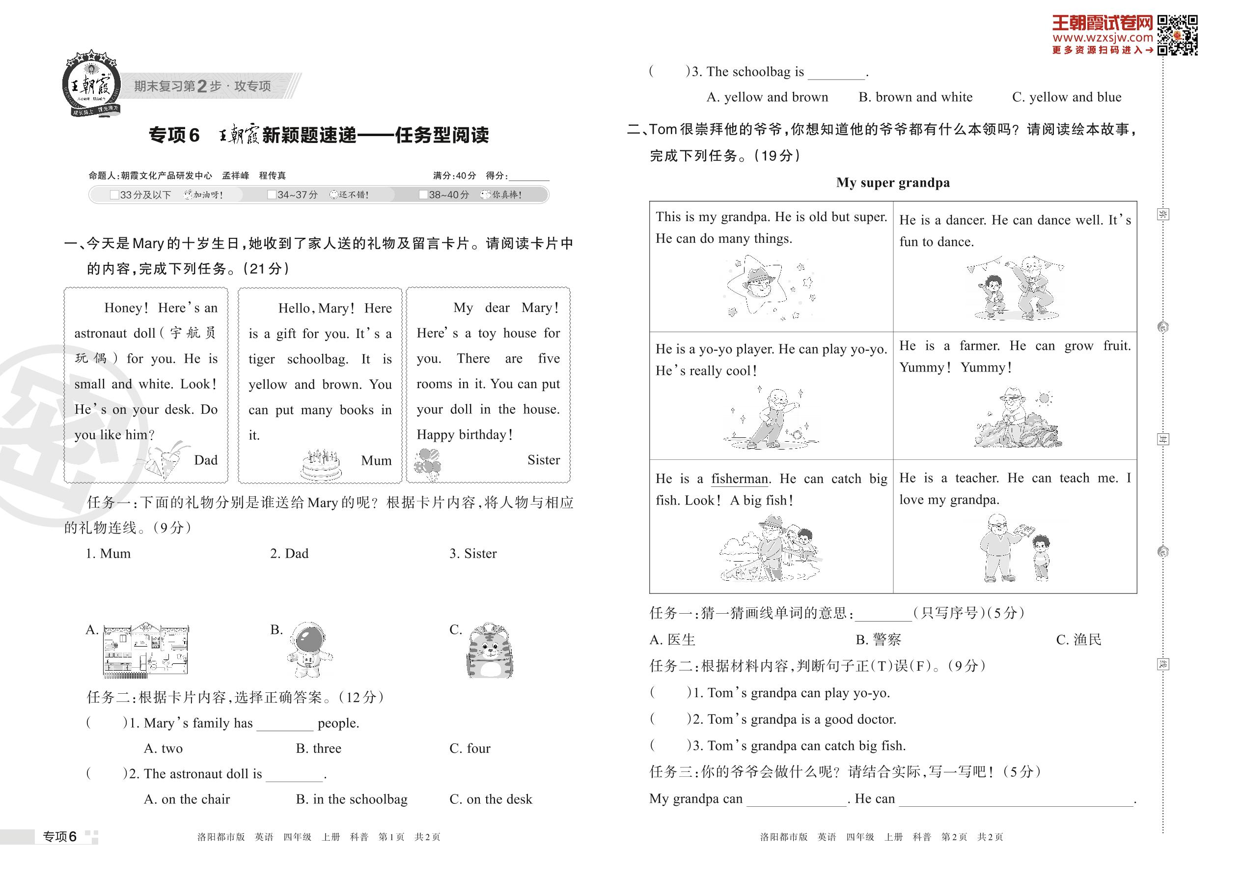 王朝霞期末专项卷——王朝霞新颖题速递:任务型阅读四年级上册英语(科普版)【6】