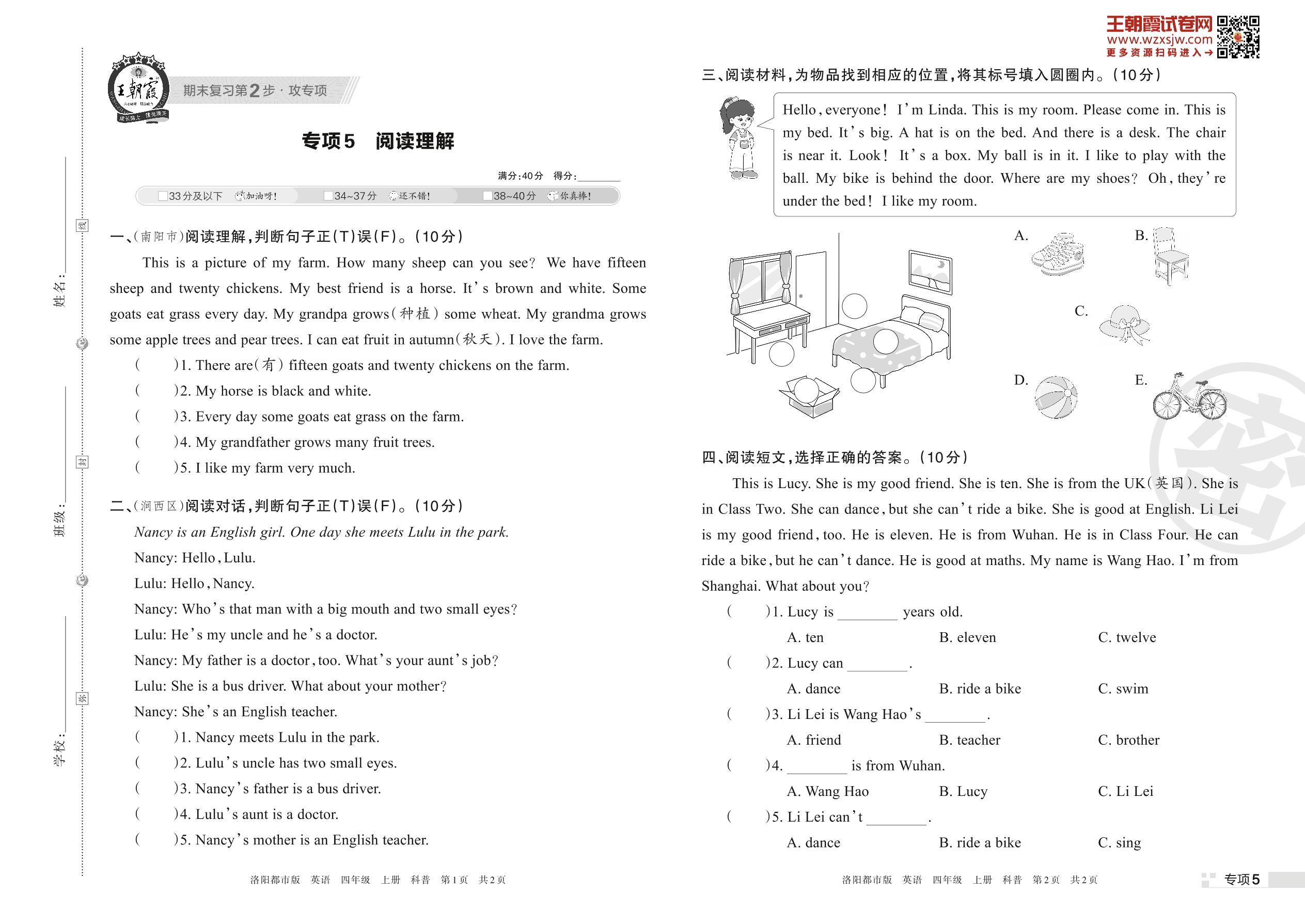 王朝霞期末专项卷——阅读理解四年级上册英语(科普版)【5】