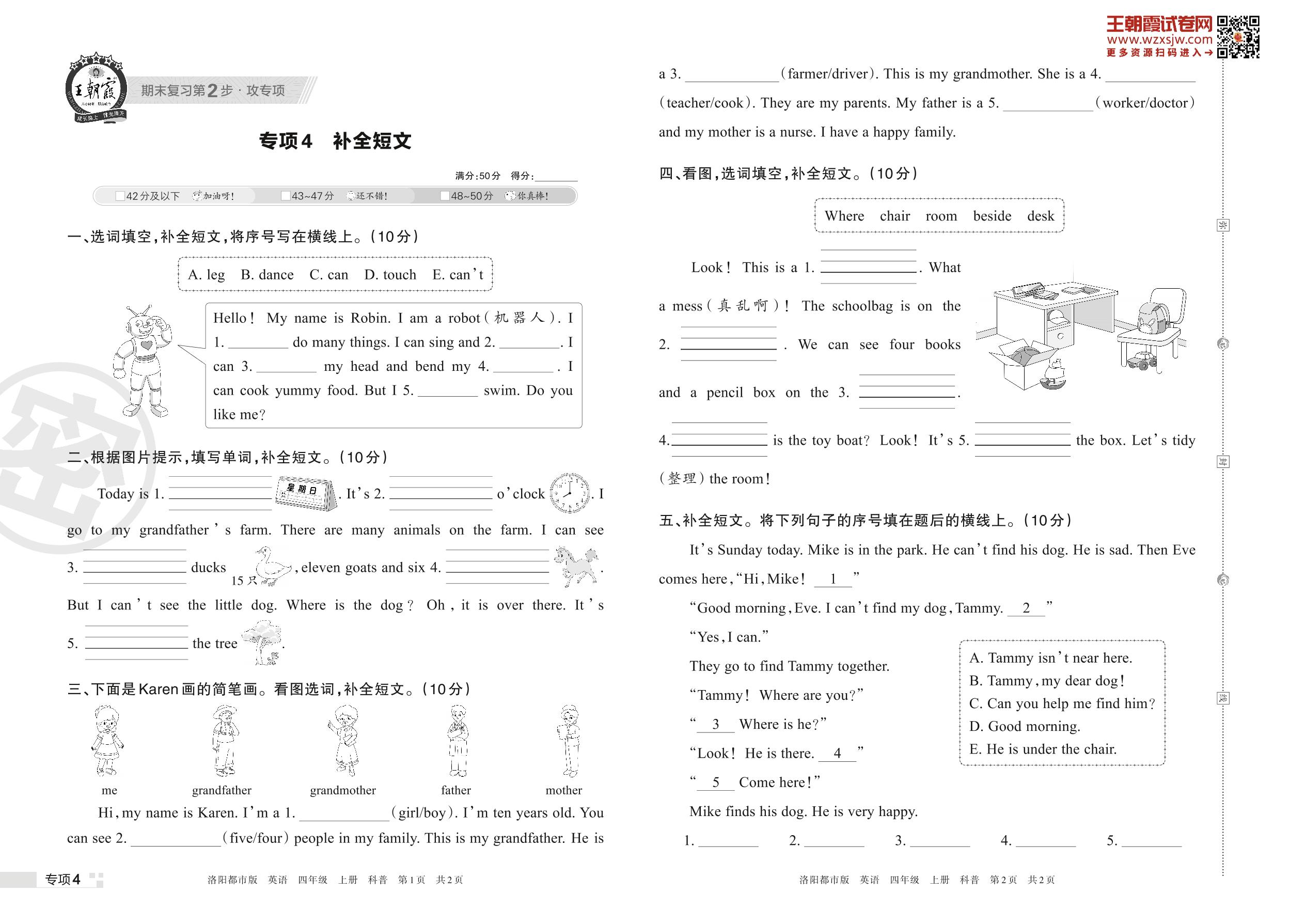 王朝霞期末专项卷——补全短文四年级上册英语(科普版)【4】