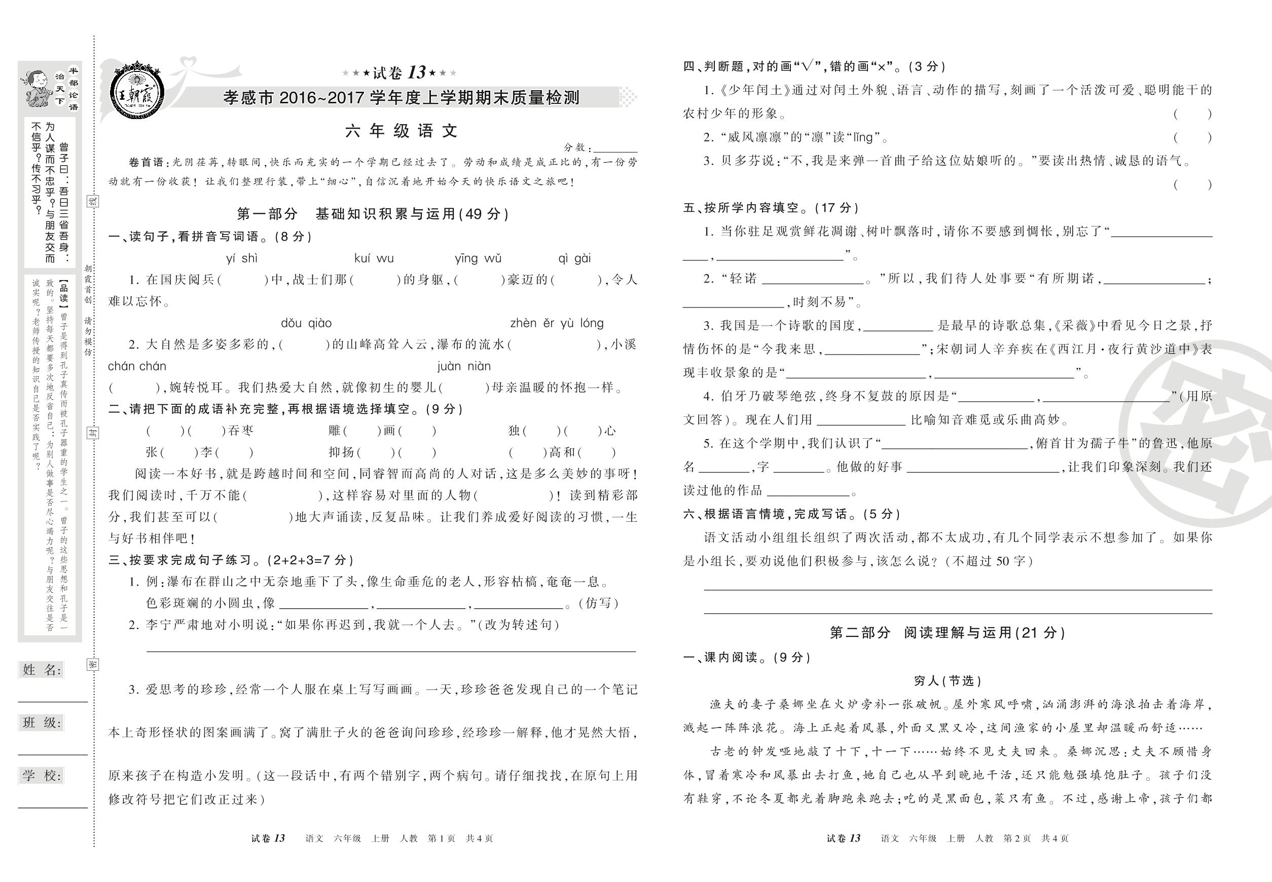 2016-2017学年第一学期孝感市六年级语文试卷(人教版)【13】