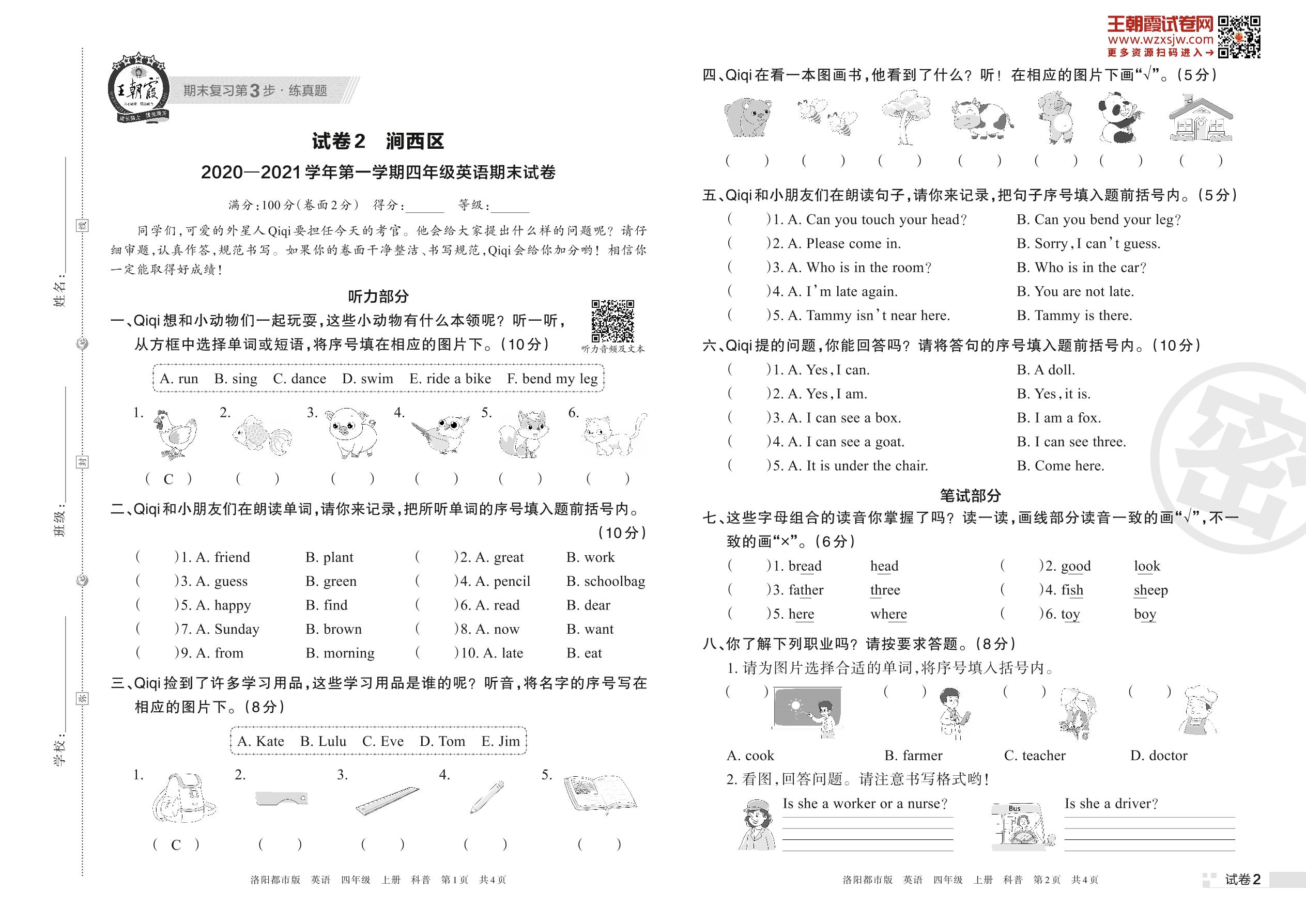 涧西区2020—2021学年第一学期四年级英语期末试卷(科普版)【2】