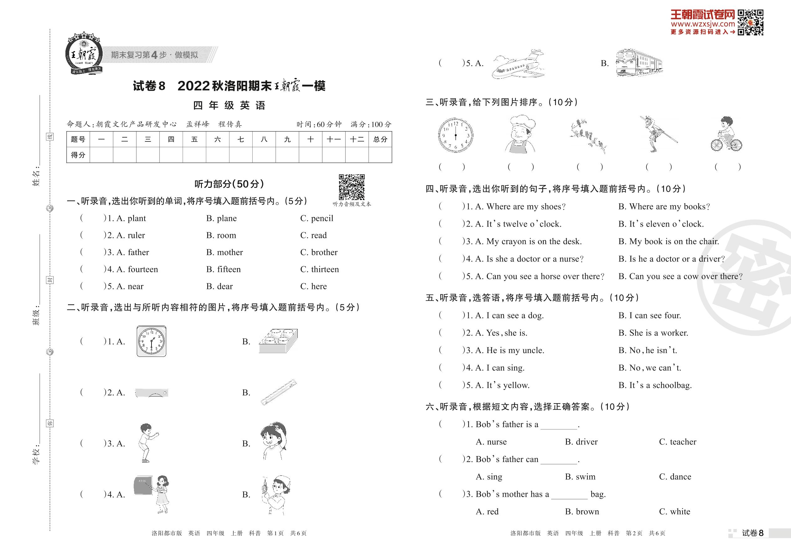 王朝霞期末模拟卷四年级上册英语(科普版)_R221111104500810【8】