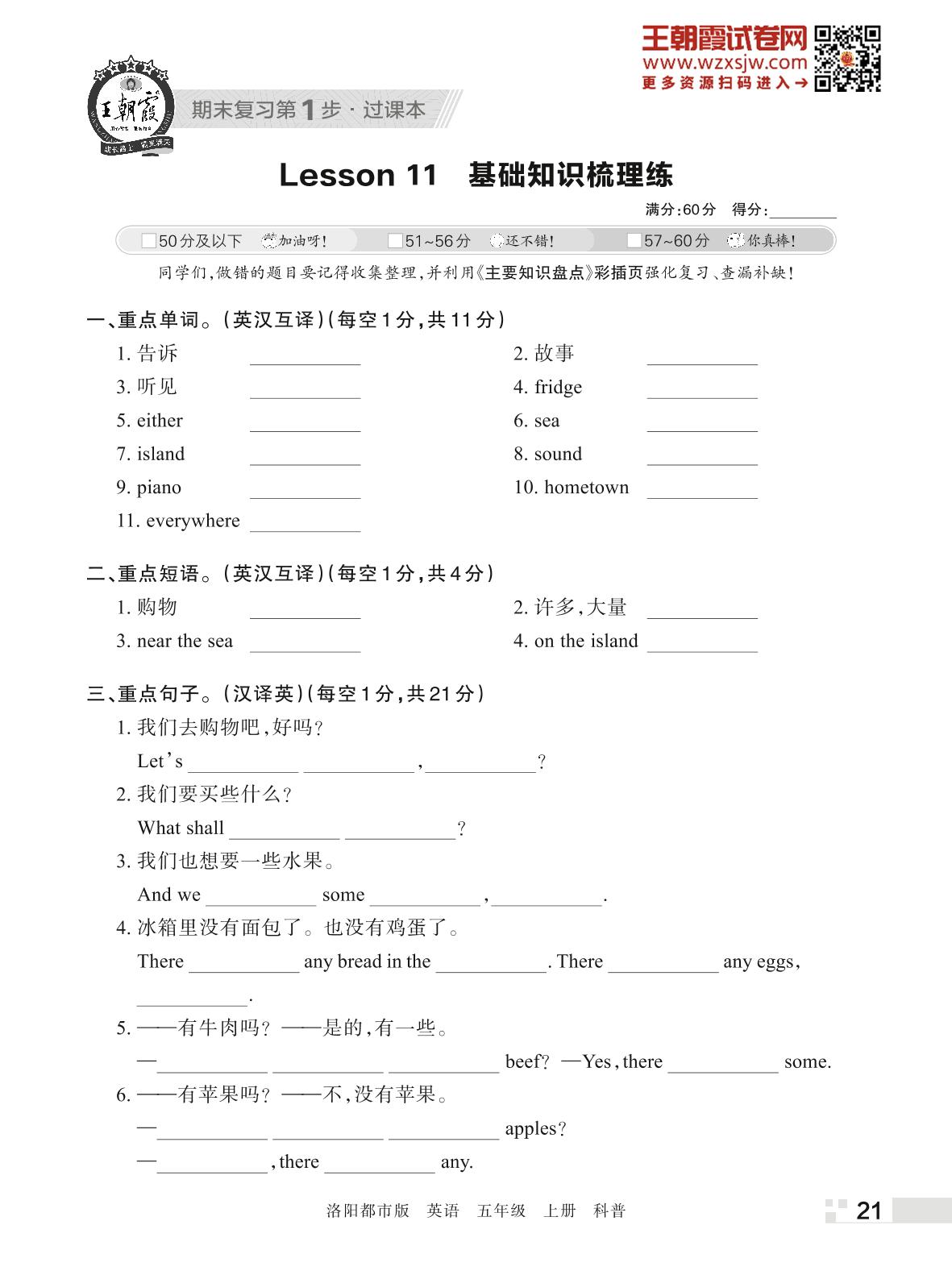 王朝霞期末过课本——Lesson 11 基础知识梳理练五年级上册英语(科普版)