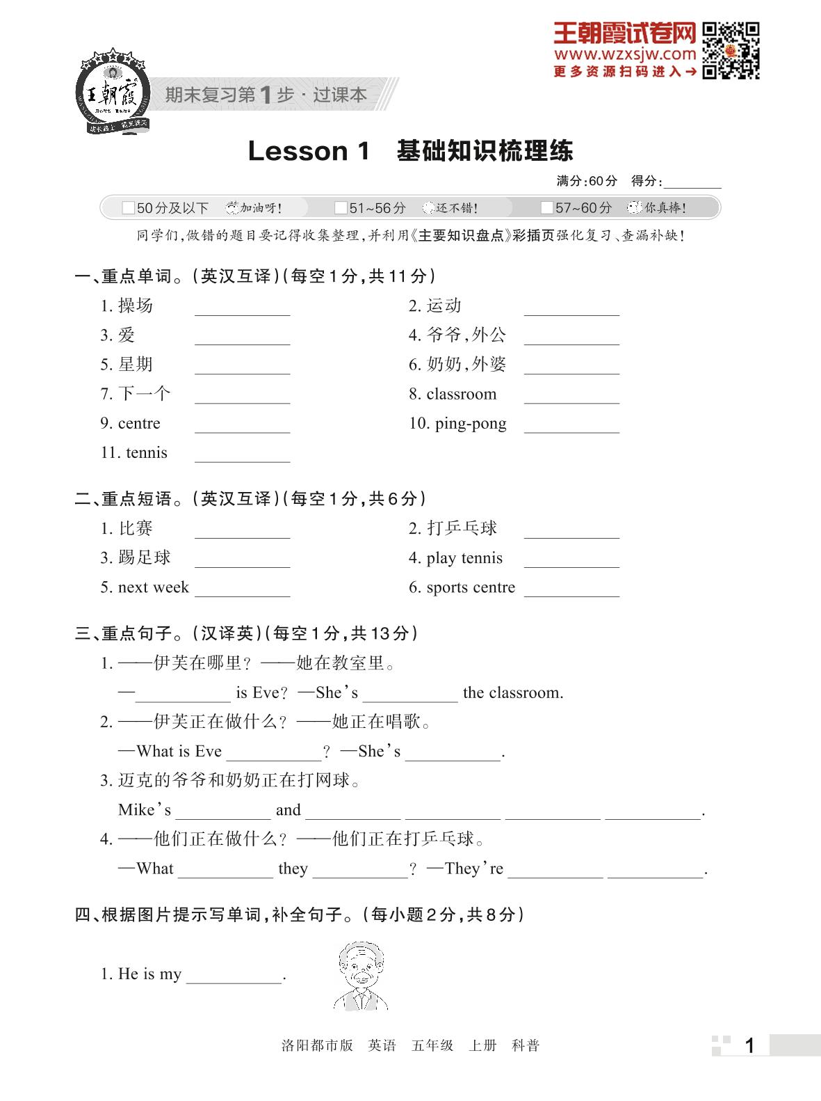 王朝霞期末过课本——Lesson 1 基础知识梳理练五年级上册英语(科普版)