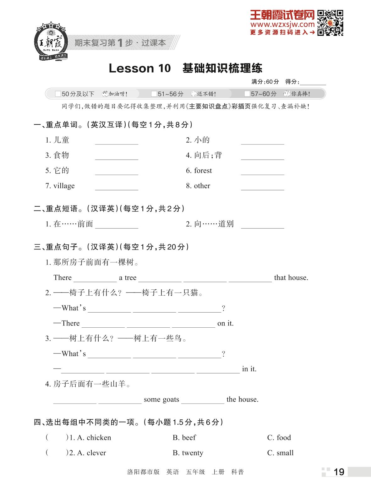 王朝霞期末过课本——Lesson 10 基础知识梳理练五年级上册英语(科普版)