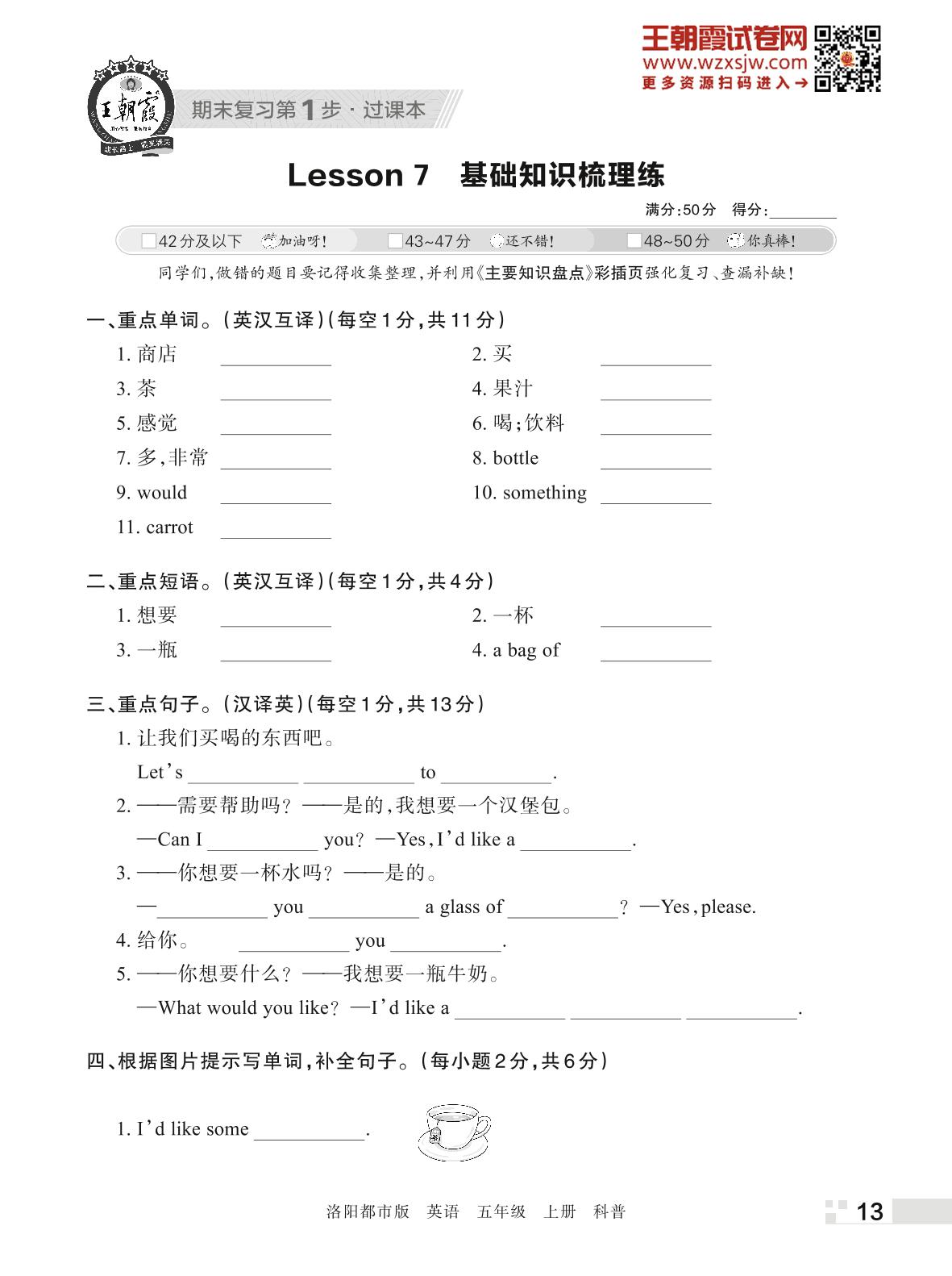 王朝霞期末过课本——Lesson 7 基础知识梳理练五年级上册英语(科普版)