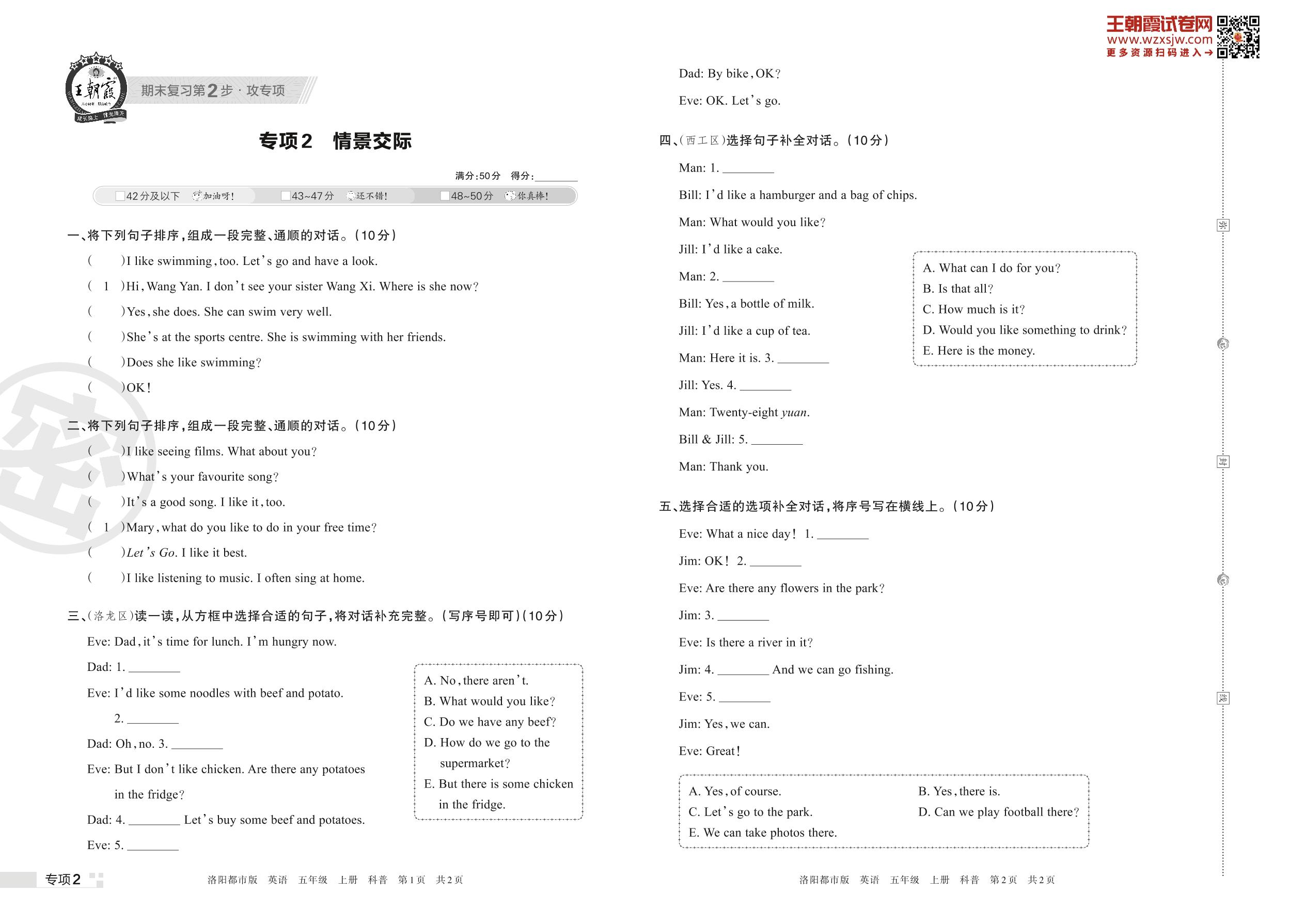 王朝霞期末专项卷——情景交际五年级上册英语(科普版)【2】